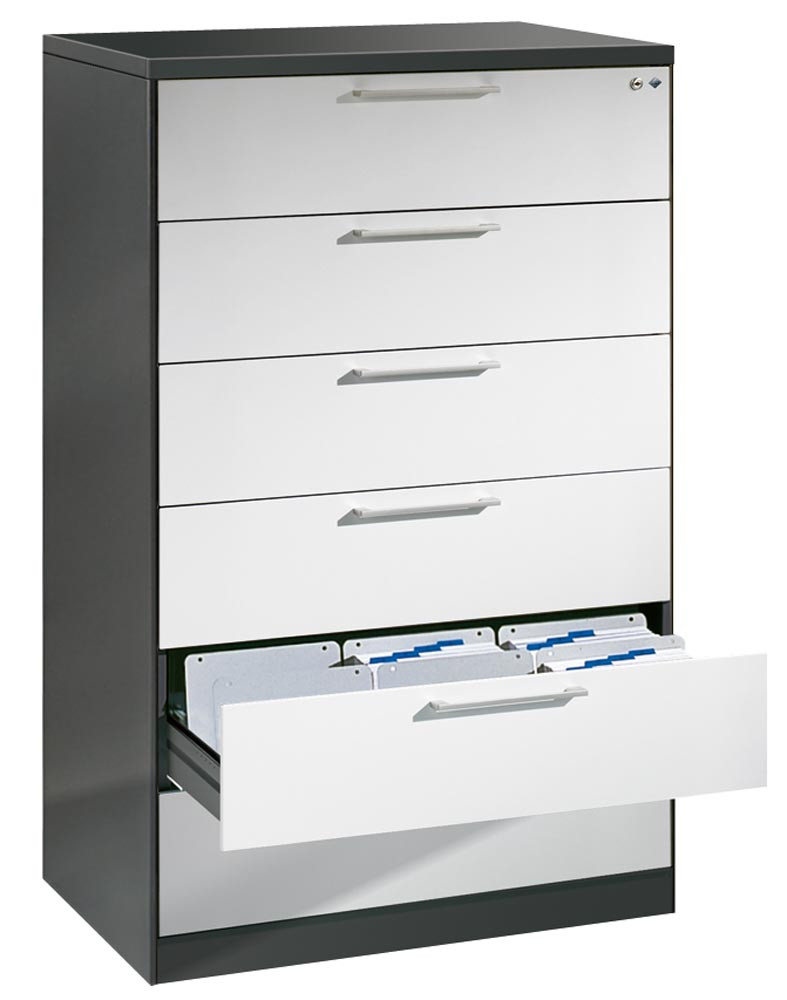 ∙ Robuste und langlebige Stahlkonstruktion mit hochwertiger Einbrennlackierung ∙ Schubladen auf 100 % ausziehbaren Kugelrollen-Teleskopführungen ∙ Schubladenfronten mit matt-verchromtem Bügelgriff ∙ Zentralverschluss mit Auszugsperre ∙ Austauschbarer Wechselkern, inkl. 2 Schlüsseln ∙ Inkl. selbstklebenden Kunststoff-Etikettenrahmen