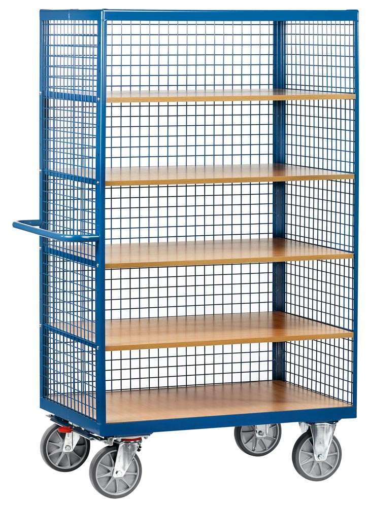 ∙ Schweißkonstruktion aus Winkelstahl ∙ Mit Rohrschiebegriff ∙ Stirnwände, 1 Längswand und Dach mit Drahtgitter 40 x 40 x 4 mm eingeschweißt · 1 Längsseite offen ∙ pulverbeschichtet ∙ Schlag- und kratzfest ∙ 1 fester und 4 verstellbare Böden aus Holzwerkstoffplatte mit Buchendekor ∙ 2 Lenk- und 2 Bockrollen ∙ TPE-Bereifung ∙ Naben mit Präzisions-Rillenkugellager · Inkl. TOTALSTOP-Zentralbremssystem