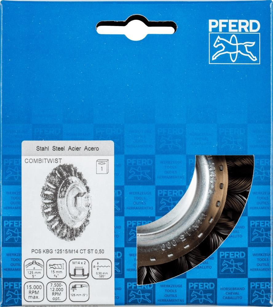 · Vorteile: Höchste Wirtschaftlichkeit durch höchste Standzeit sowie Materialabtrag., Hoher Arbeitskomfort durch ruhigen Lauf ohne Rückschlagen der Bürste., Zur Bearbeitung von Ecken und Kanten geeignet, da sich die Zöpfe weniger aufdrehen., Aggressiver Bürsteffekt durch hohe Steifigkeit der Drahtzöpfe., Optimales Erreichen von schwer zugänglichen Stellen wie Innenkanten, Rillen und Nuten., Lange Standzeit durch die Verwendung von PFERD-Spezialdraht.