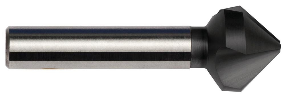 Kegelsenker mit 3-Schneiden · 90° Anfaswinkel · maximaler Durchmesser 6.30mm mit einer Gesamtlänge von 45mm und einer Kopflänge von 5.6mm und 5mm Polygonschaft · gemäß DIN 335 C Standard zur Herstellung eines konischen Sitzes für ISO-metrische Senkkopfschrauben mit einem minimalen Bohrdurchmesser von 1.50mm · HSS mit Standard TiAlN beschichtet zum zerspanen von freie Bearbeitung · einfachem Kohlenstoffstahl · Stahllegierungen und Werkzeugstahl Stahl · Grau · formbaren · dehnbaren und verdichteter Graphit Gusseisen · gegossenes Aluminium und Kupfer und Kupferlegierungen