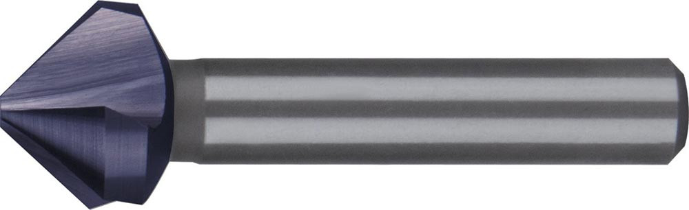 HSS-TiAlN · DIN 335 C · 3 Schneiden · Senkwinkel 90 ° · Zylinderschaft · rechtsschneidend · zum grat- und ratterfreien Ansenken, Entgraten und Versenken · beste Ergebnisse bei niedriger Schnittgeschwindigkeit · höhere Oberflächenhärte ca. 3000 HV · zur Trockenbearbeitung, bei Stahl, Guss, Bunt- und Leichtmetallen