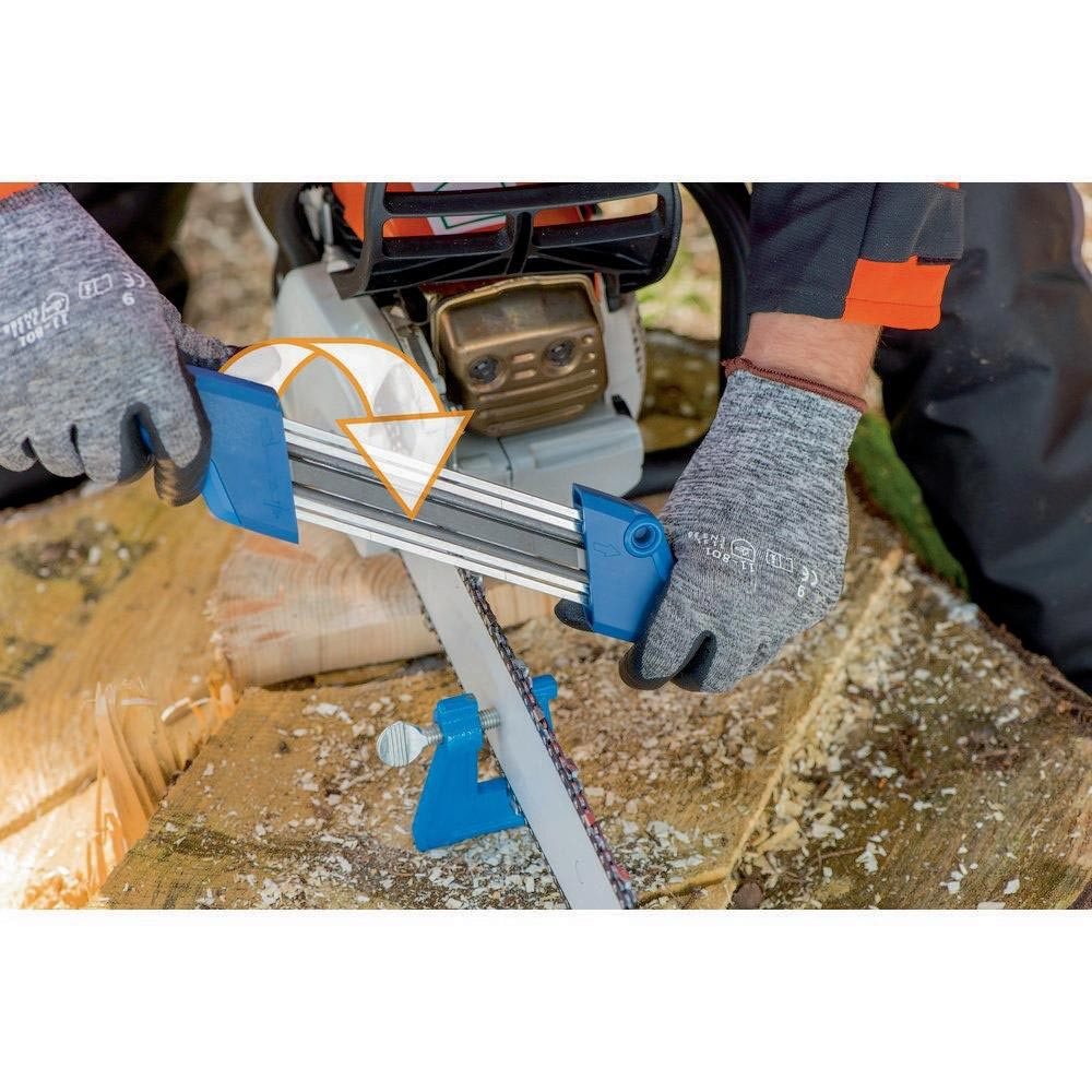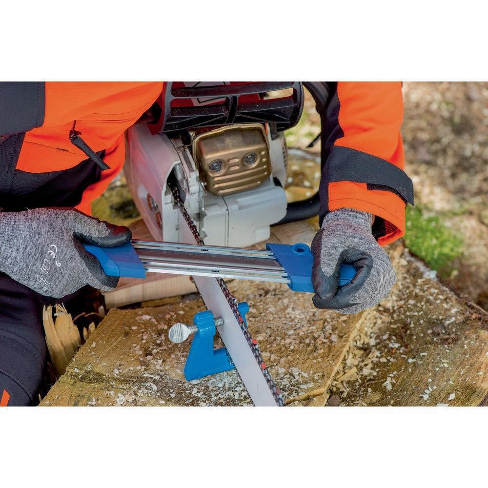 · Vorteile: Einfache Handhabung und vorgegebener Schärfwinkel. Gleichzeitiges Schärfen der Zahnschneide und Justieren des Tiefenbegrenzers. Flexibler Einsatz vor Ort durch kompakten Aufbau der Geräte. Lange Nutzungsdauer durch auswechselbare Feilen. Wechsel vom rechten zum linken Zahn durch Wenden des Gerätes, kein Umbau erforderlich. Einfaches Auswechseln der Feilen durch verbesserte Geräteform. Präzise und einheitliche Schärfergebnisse auch bei ungeübten Anwendern. Optimierte Form für präzise Führung und optimale Schärfergebnisse.