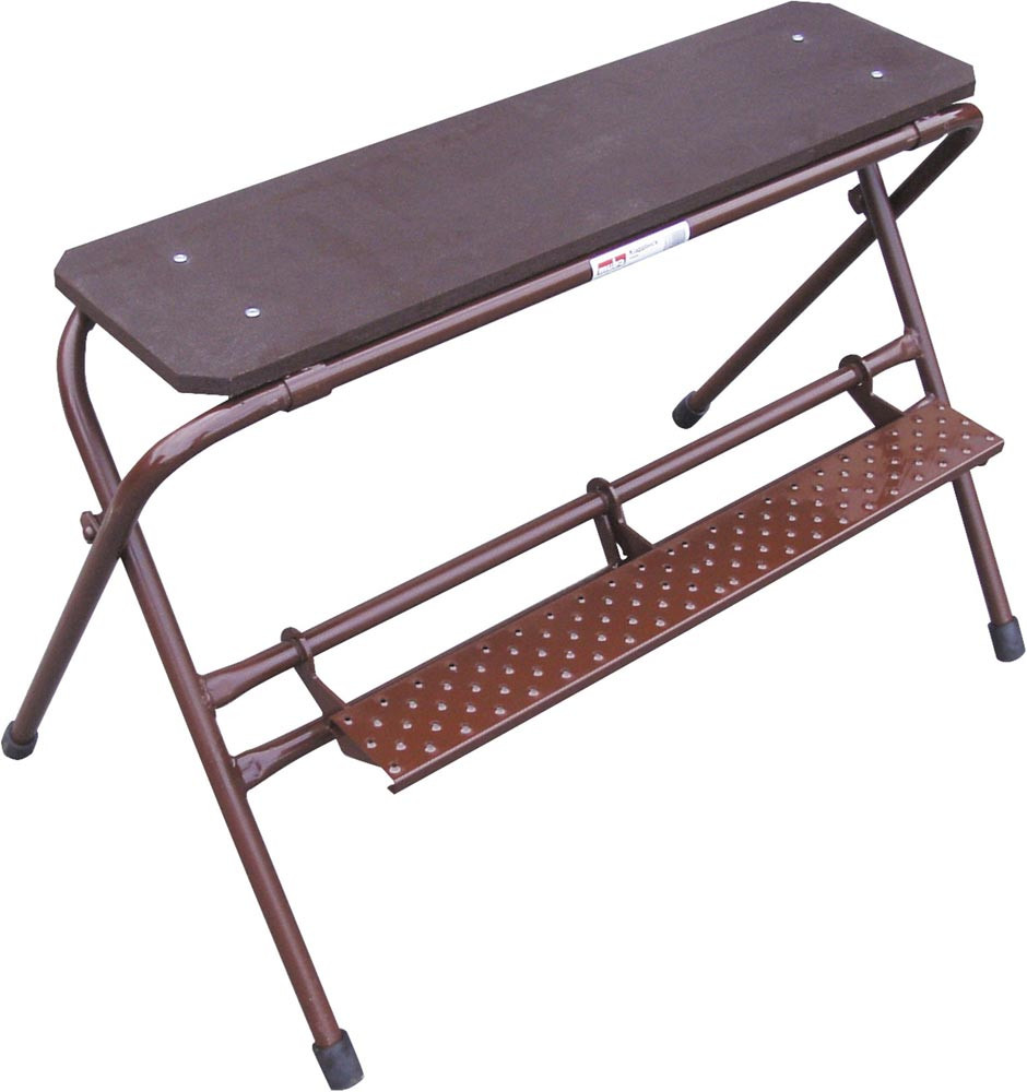 standfest · zusammenklappbar · Aufstandsfläche aus wasserfest verleimtem Mehrschichtenholz · Stufenbelag aus rutschfestem Stahl-Lochblech