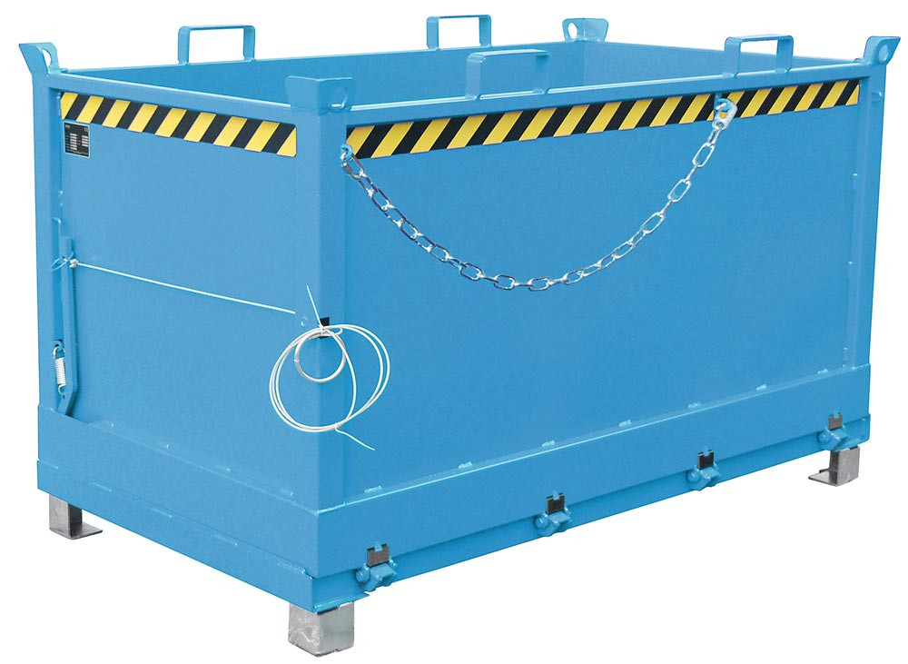 ∙ Entriegelung der Bodenklappe per Seilzug vom Stapler aus ∙ Bodenklappe schließt beim Aufsetzen selbsttätig, 90° Öffnungsbereich ∙ Sicherung für Bodenklappe gegen Abrutschen und ungewünschtes Öffnen ∙ Aufnahme für Gabelstapler und Kran sowie mit Gabelhubwagen transportierbar ∙ Robuste Stahlblechkonstruktion: Wandstärke 3 mm, Bodenklappenstärke 4 mm ∙ Einfahrbügel an der Oberseite des Behälters, Einfahrtaschen an der Unterseite · Unterfahrhöhe 100 mm