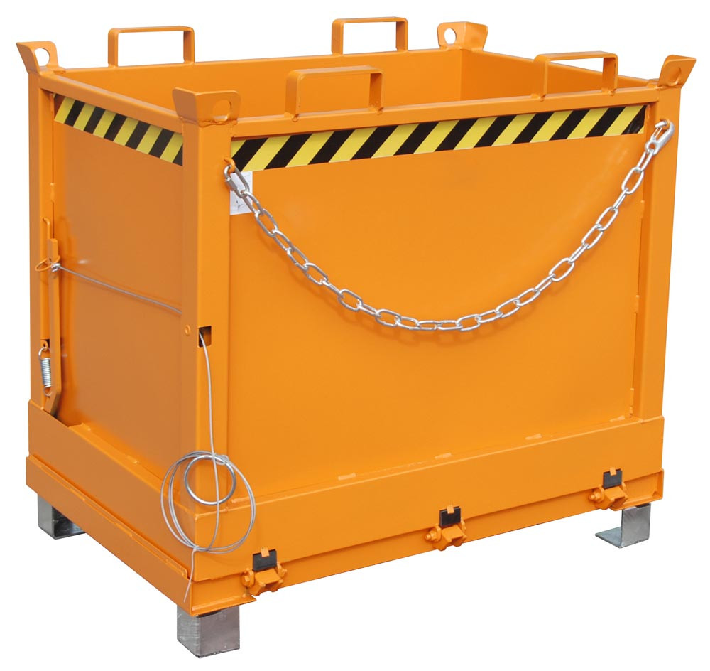 ∙ Entriegelung der Bodenklappe per Seilzug vom Stapler aus ∙ Bodenklappe schließt beim Aufsetzen selbsttätig, 90° Öffnungsbereich ∙ Sicherung für Bodenklappe gegen Abrutschen und ungewünschtes Öffnen ∙ Aufnahme für Gabelstapler und Kran sowie mit Gabelhubwagen transportierbar ∙ Robuste Stahlblechkonstruktion: Wandstärke 3 mm, Bodenklappenstärke 4 mm ∙ Einfahrbügel an der Oberseite des Behälters, Einfahrtaschen an der Unterseite · Unterfahrhöhe 100 mm
