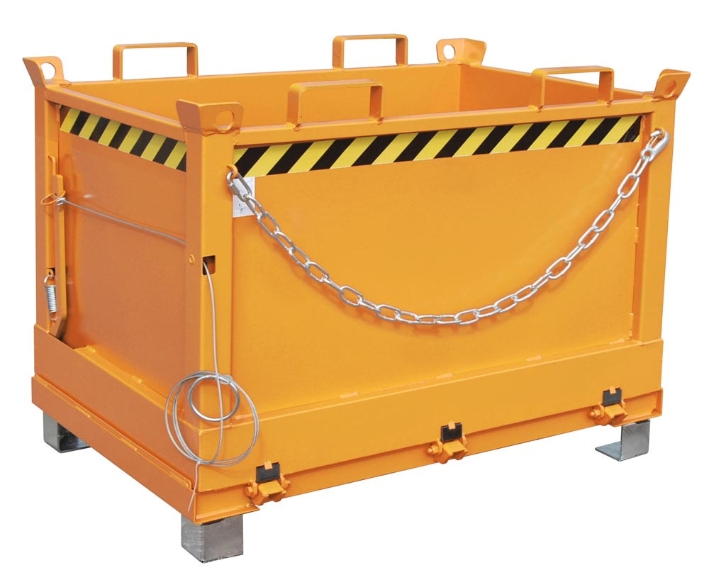 ∙ Entriegelung der Bodenklappe per Seilzug vom Stapler aus ∙ Bodenklappe schließt beim Aufsetzen selbsttätig, 90° Öffnungsbereich ∙ Sicherung für Bodenklappe gegen Abrutschen und ungewünschtes Öffnen ∙ Aufnahme für Gabelstapler und Kran sowie mit Gabelhubwagen transportierbar ∙ Robuste Stahlblechkonstruktion: Wandstärke 3 mm, Bodenklappenstärke 4 mm ∙ Einfahrbügel an der Oberseite des Behälters, Einfahrtaschen an der Unterseite · Unterfahrhöhe 100 mm