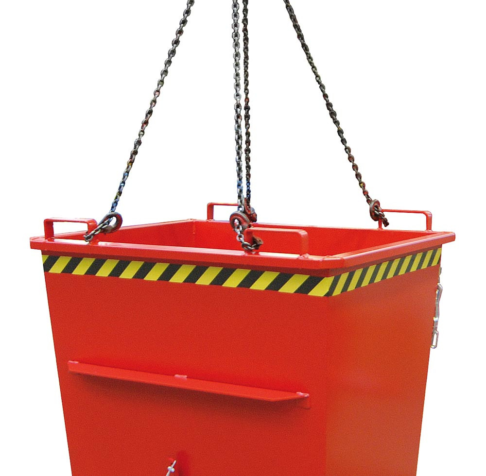 ∙ Entriegelung der Bodenklappe per Seilzug vom Stapler aus ∙ Bodenklappe schließt beim Aufsetzen selbsttätig, 90° Öffnungsbereich ∙ Sicherung für Bodenklappe gegen Abrutschen und ungewünschtes Öffnen ∙ Aufnahme für Gabelstapler und Kran sowie mit Gabelhubwagen transportierbar ∙ Robuste Stahlblechkonstruktion: Wandstärke 3 mm, Bodenklappenstärke 4 mm ∙ Einfahrbügel an der Oberseite des Behälters, Einfahrtaschen an der Unterseite · Unterfahrhöhe 100 mm