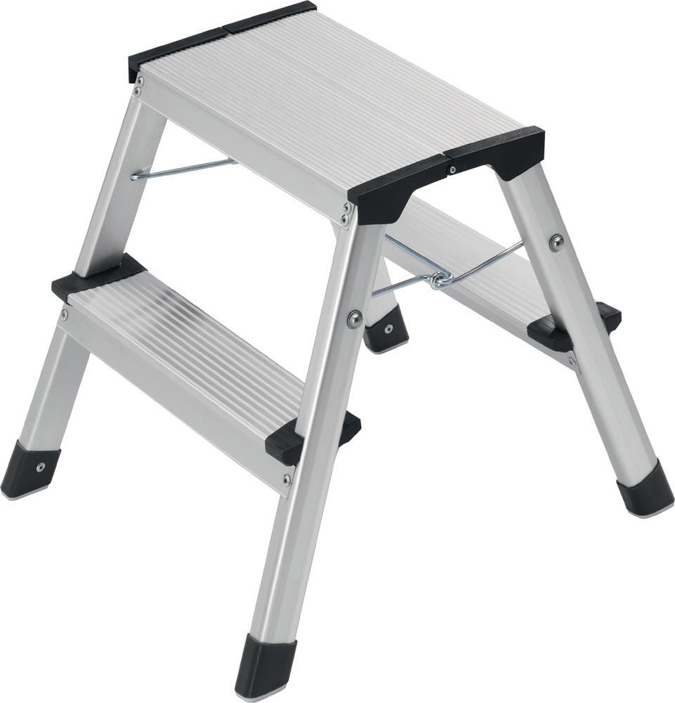 Aluminium · leicht und handlich · platzsparend, zusammenklappbar · Stufen mit Anti-Rutsch-Riffelung · Holme eloxiert · Sicherheitsverriegelung · 2-Komponenten-Kunststofffuß für sicheren Stand auf verschiedenen Böden · max. Gesamtbelastung 150 kg