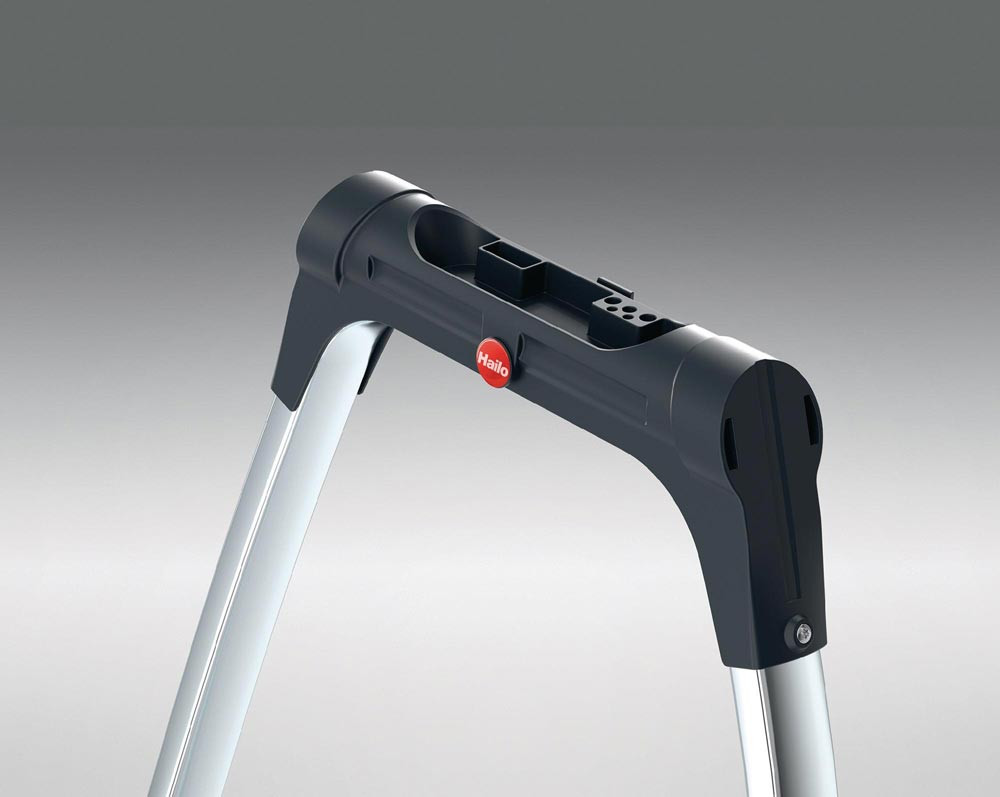 stabile Aluminiumholme · mit hochgeschwungenem Aluminium-Sicherheitsbügel · praktische Ablageschale für Kleinteile · treppenförmige Stufenanordnung · extra große, rutschfest geriffelte Aluminium-Stufen B 300 x T 225 mm · Leiterschuhe mit Soft-Grip Sohle für optimalen Stand auf verschiedenen Böden · max. Gesamtbelastung 150 kg