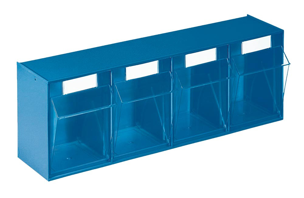 Klarsichtbehälter aus Kunststoff in blauem Gehäuse aus schlagfestem Polystyrol · Behälter sind zur Entnahme nach vorn schwenkbar und lassen sich herausnehmen · Gehäusebreite 600 mm · stapelbar und für die Wandbefestigung geeignet