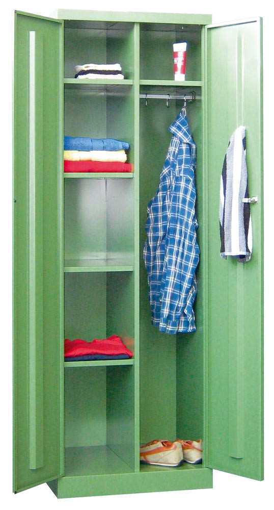 Kleider-Wäscheschrank mit Sockel, mittig Trennw., li. 4, re 1 Boden und Stange mit 3 Haken, BxTxH 600x500x1800 mm, RAL 6011 E1576223