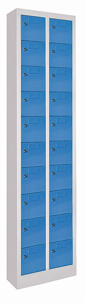 Kleinfachschrank, BxTxH 460x200x1950 mm, 2x10 Fächer, Fachbreite 145 mm, Schloss, Sockel, RAL 7035/5010 lichtgrau/enzianblau