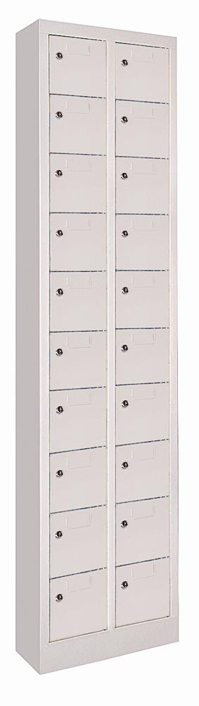 Kleinfachschrank, BxTxH 460x200x1950 mm, 2x10 Fächer, Fachbreite 145 mm, Schloss, Sockel, RAL 7035 lichtgrau E1571210
