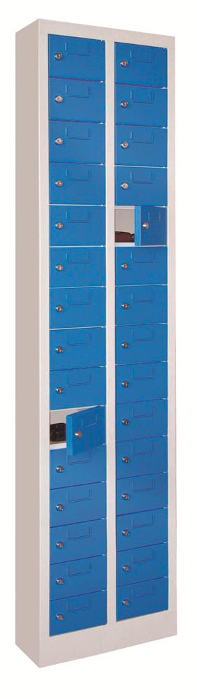 Kleinfachschrank, BxTxH 460x200x1950 mm, 2x15 Fächer, Fachbreite 145 mm, Schloss, Sockel, RAL 7035/5010 lichtgrau/enzianblau
