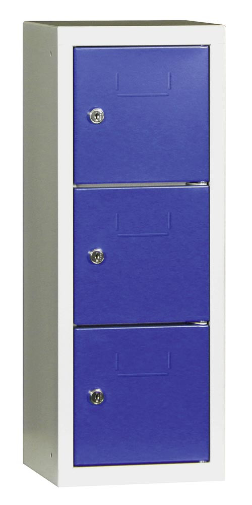 Kleinfachschrank, Modulsystem, Wandbefestigung, BxTxH 225x200x598 mm, 3 Fächer, Türen mit Etikettenrahmen, Schloss, RAL 7035/5010 lichtgrau/enzianblau