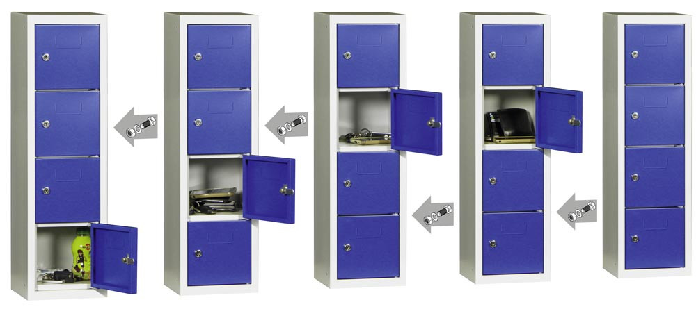 Kleinfachschrank, Modulsystem, Wandbefestigung, BxTxH 225x200x598 mm, 3 Fächer, Türen mit Etikettenrahmen, Schloss, RAL 7035/5010 lichtgrau/enzianblau E6011848