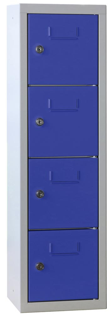 Kleinfachschrank, Modulsystem, Wandbefestigung, BxTxH 225x200x778 mm, 4 Fächer, Türen mit Etikettenrahmen, Schloss, RAL 7035/5010 lichtgrau/enzianblau