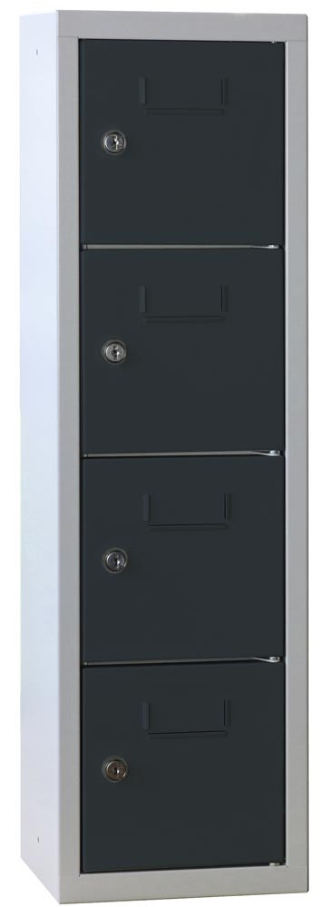 Kleinfachschrank, Modulsystem, Wandbefestigung, BxTxH 225x200x778 mm, 4 Fächer, Türen mit Etikettenrahmen, Schloss, RAL 7035/7016 lichtgrau/anthrazit