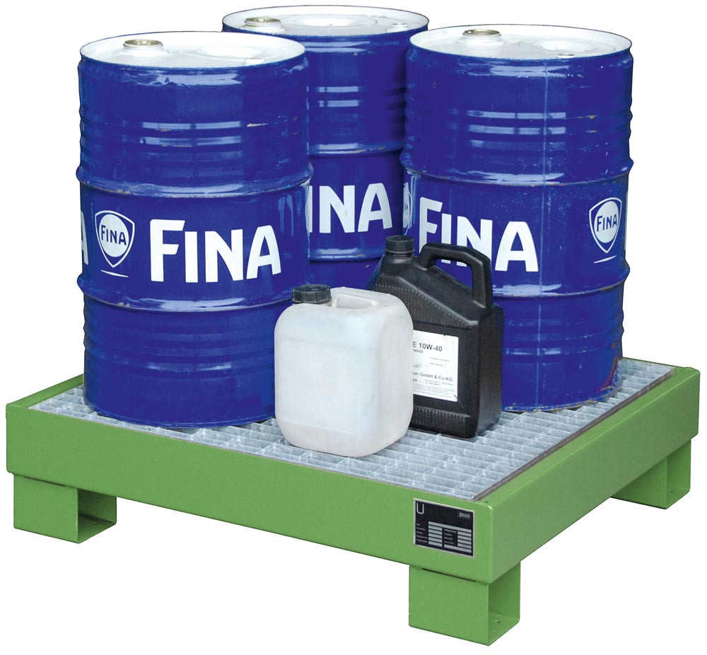 Kleingebinde-Auffangwanne, BxTxH 910x800x225 mm, Auffangvolumen 61 l, mit Gitterrost, 4x60 l-Fass, RAL 6011