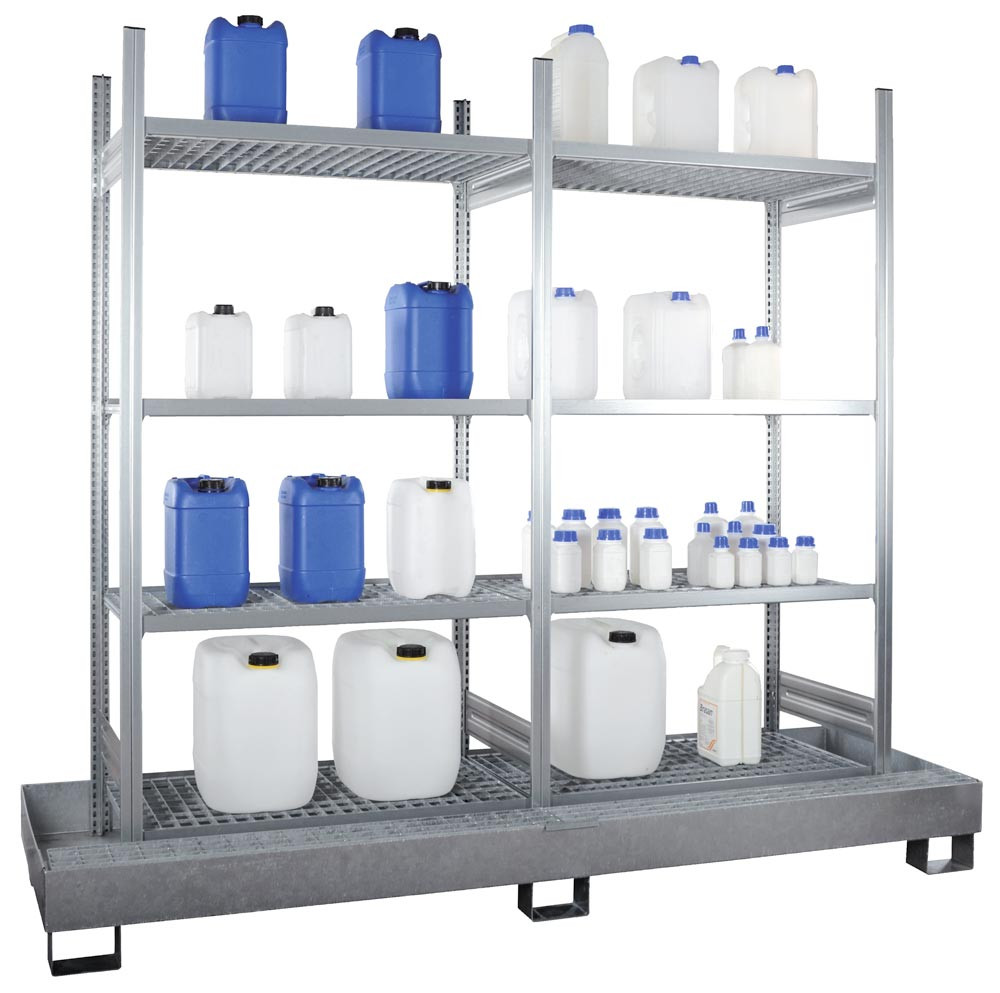 Kleingebinderegal mit 2x4 Gitterrostböden und 1 Auffangwanne verzinkt, Vol. 210 l, BxTxH 2085x635x2100 mm