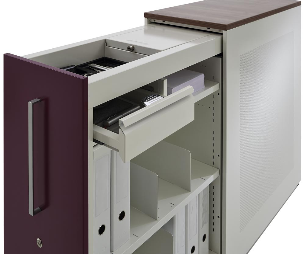 Kleinschublade, mit Gefach-Trennwand, reinweiß, Einbau unter Fachboden links in 2. OH, für Hochauszugschrank