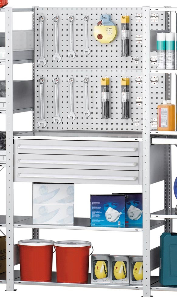 Kleinteile-Regalmodul 3, Anbaufeld, BxTxH 1000x500x2000 mm, 3 Böden verz. 150 kg, 1 Schlitz-/ 1 Lochplatte, 1x3er Schublade E876923