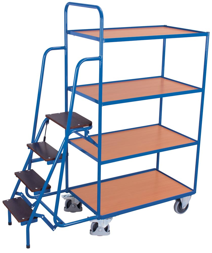 Kommissionierwagen, 4 Ladeflächen LxB 985x590 mm, Leiter 4-stufig, Außenmaße LxBxH 1695x625x1900 mm, Traglast 250 kg E1320602