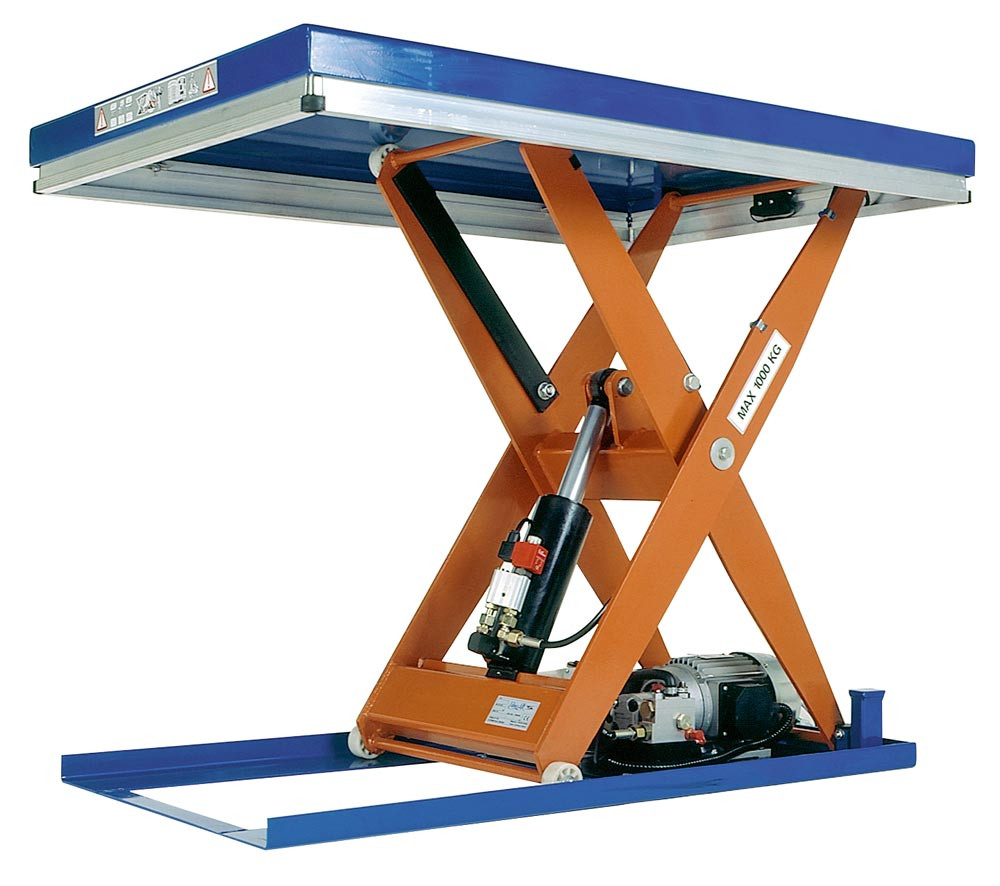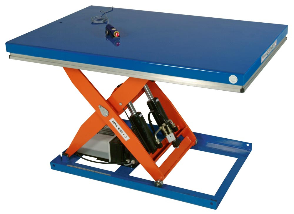 · Freie Aufstellung · Erweiterbar für den Einbau in eine Bodengrube (bitte anfragen) · Per Knopfdruck fährt die Tischplatte stufenlos auf die gewünschte ergonomisch richtige Arbeitshöhe · Handtaster mit den Funktionen Heben/Senken/Not-Aus an 3 m langem Bedienungskabel ∙ 400 V Elektro-Hydraulik-Aggregat im Gerät integriert · Ausgestattet mit Sicherheitsleisten und Sicherheitsventilen ∙ Hergestellt nach EN 1570-1, mit CE-Kennzeichnung · Pulverbeschichtung RAL 5002 ultramarinblau / RAL 2009 signalorange