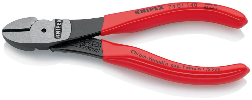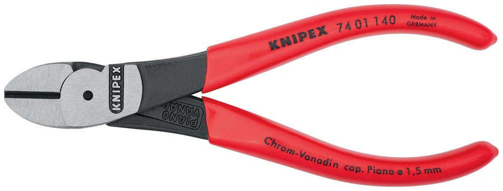 20 % Kraftersparnis gegenüber herkömmlichen Seitenschneider · Schneiden zusätzlich induktiv gehärtet, Schneidenhärte ca. 64 HRC · Chrom-Vanadin-Hochleistungsstahl, geschmiedet, mehrstufig ölgehärtet