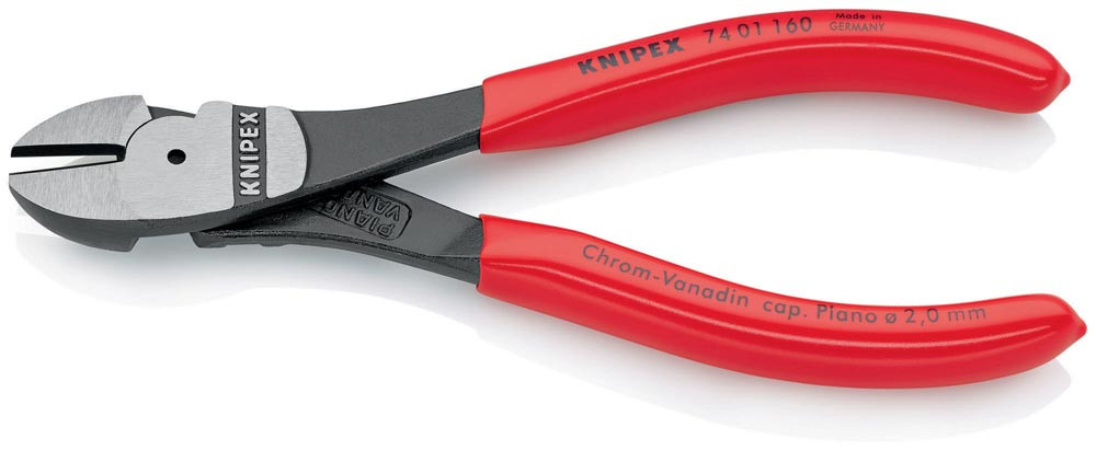 20 % Kraftersparnis gegenüber herkömmlichen Seitenschneider · Schneiden zusätzlich induktiv gehärtet, Schneidenhärte ca. 64 HRC · Chrom-Vanadin-Hochleistungsstahl, geschmiedet, mehrstufig ölgehärtet