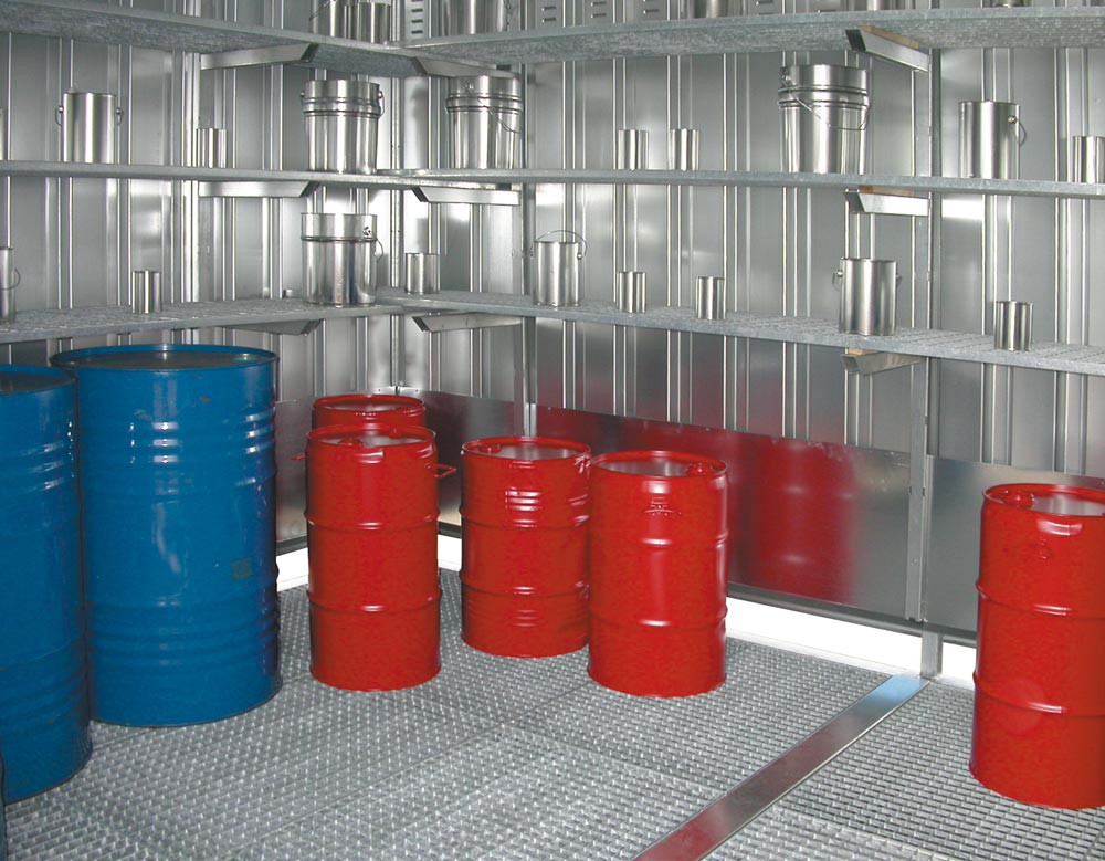 ∙ Gitterrost-Regal-Set mit 3 Lagerebenen an einer Containerwand vormontiert ∙ Maße B x T 2600 x 500 mm ∙ Traglast 150 kg je Ebene