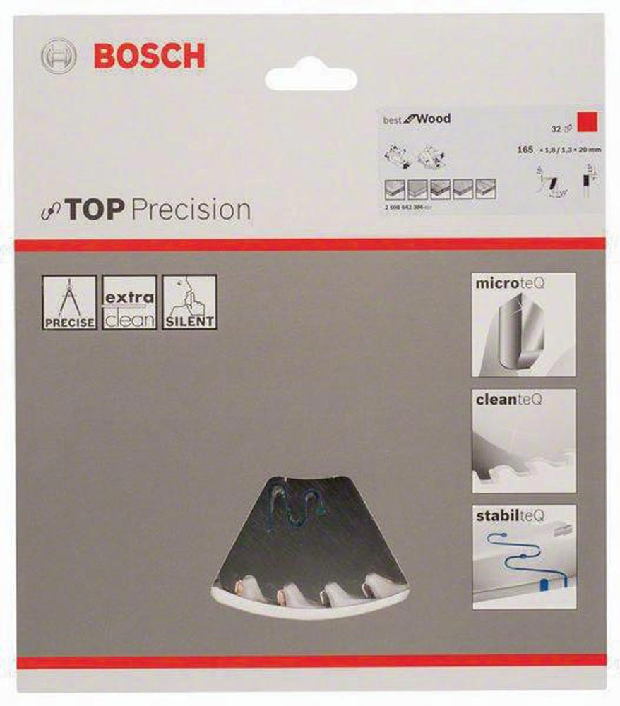 Kreissägeblatt Top Precision Best for Wood für Tauch- und Handkreissägen · Außendurchmesser: 165 mm · Bohrung: 20 mm · Schnittbreite: 1,8 mm · Zähnezahl: 32 · für präzise · saubere und leise Schnitte in allen Holzarten mit Tauch- und Handkreissägen · Zähne aus Microteq · Hartmetallzähne aus besonders dichtem Hartmetallpulver mit mikrofeiner Körnung minimieren die Abnutzung der Schneide für beste Schnittqualität und hohe Lebensdauer · Beschichtung Cleanteq: verringert das Anhaften von Rückständen (Harz · Leim) · Vibrationsminderung mit Stabilteq: Vibrationen und Geräuschentwicklung werden stark verringert · mit lasergeschnittenen Dehnungsschlitzen für hohe Blattstabilität und Genauigkeit · erstklassiger Stahl (bis HRC 46) für hohe Haltbarkeit · dank dem speziell eingerollten Spannungsring bleiben die Blätter auch im Einsatz formstabil und eben
