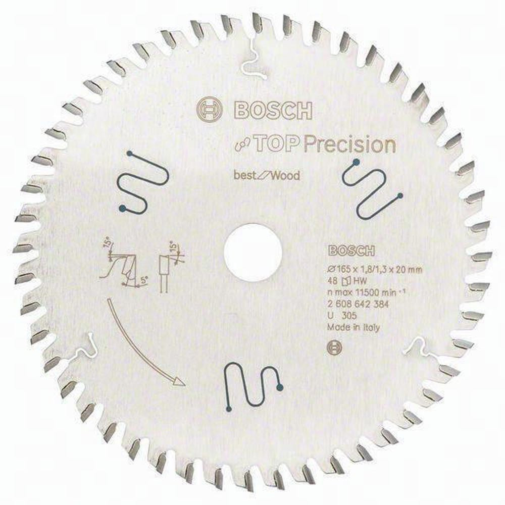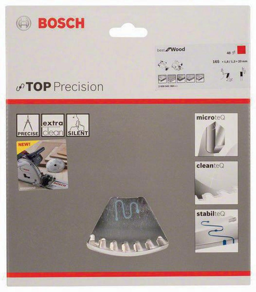Kreissägeblatt Top Precision Best for Wood für Tauch- und Handkreissägen · Außendurchmesser: 165 mm · Bohrung: 20 mm · Schnittbreite: 1,8 mm · Zähnezahl: 48 · für präzise · saubere und leise Schnitte in allen Holzarten mit Tauch- und Handkreissägen · Zähne aus Microteq · Hartmetallzähne aus besonders dichtem Hartmetallpulver mit mikrofeiner Körnung minimieren die Abnutzung der Schneide für beste Schnittqualität und hohe Lebensdauer · Beschichtung Cleanteq: verringert das Anhaften von Rückständen (Harz · Leim) · Vibrationsminderung mit Stabilteq: Vibrationen und Geräuschentwicklung werden stark verringert · mit lasergeschnittenen Dehnungsschlitzen für hohe Blattstabilität und Genauigkeit · erstklassiger Stahl (bis HRC 46) für hohe Haltbarkeit · dank dem speziell eingerollten Spannungsring bleiben die Blätter auch im Einsatz formstabil und eben