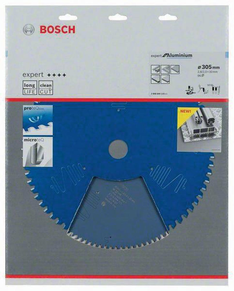 Kreissägeblatt Expert for Aluminium für Kapp- · Gehrungs- und Paneelsägen. Außendurchmesser: 305 mm · Bohrung: 30 mm · Schnittbreite: 2,8 mm · Stammblattstärke: 2,0 mm · Zähnezahl: 96. FDas Expert for Aluminium Kreissägeblatt macht perfekte Schnitte in Nichteisenmetalle wie Aluminium. Auch geeignet zum Schneiden von Kunststoffen und Epoxy · rohen Spanplatten · Akustikplatten · Leichtbauplatten · abrasive ein- oder zweiseitig beschichtete Plattenwerkstoffe sowie Faserwerkstoffe wie MDF- und OSB-Platten. Einzigartige besonders harte Microteq-Zähne · die von Bosch intern produziert werden · werden aus sehr feinem Hartmetallkorn hergestellt · wodurch die Lebensdauer und Leistung des Blatts maximiert wird. Diese Leistung wird durch die Schutzbeschichtung des Blatts unterstützt · die Korrosion verhindert und zuverlässiges Schneiden ermöglicht · während Reibung reduziert wird. Das Produkt ist mit Dämpfungsschlitzen für einen besonders ruhigen Lauf · deutlich weniger Geräusche und spürbar geringere Vibration ausgestattet. Die Verwendung des Universalschneidöls 2 607 001 409 erhöht die Standzeit bei Schnitten in Metall · z. B. Aluminium · um ein Mehrfaches.