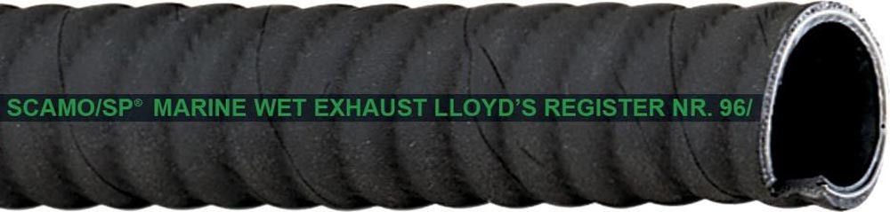 Kühlwasserschlauch für Schiffsmotoren · Aufdruck: Scamo/SP® Marine wet exhaust LLOYD'S Register nr. 96/00127(E4) RINA nr. DIP061008CS - 20/03/08 SAE J 2006:03 R2 - ISO 13363:04 Type 2 CLASS B - (D. Quartal/Jahr) · Farbe Innenseele: Schwarz · Fertigungsart Innenseele: Glatt, kühlwasser- und salzwasserbeständig · Fertigungsweise Aussendecke: Gewickelt, Gewellt · Vakuum: 0,80bar