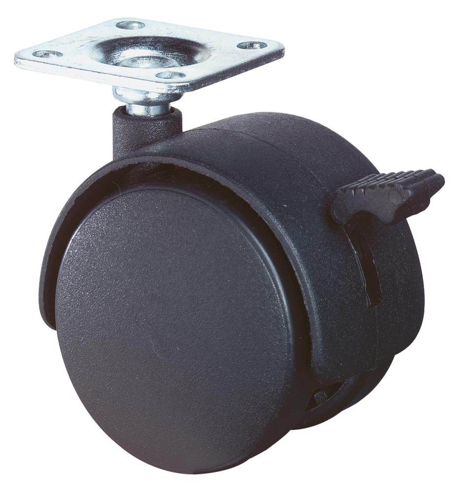 Kunststoff-Doppelrolle m. Festst., schwarz, Durchm. 40 mm, Traglast 30 kg, Anschraubplatte, für weiche Böden, VE 8 Stück