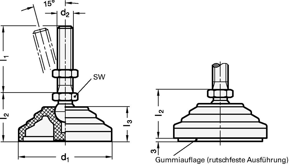 mit Mutter, mit Gummiauflage · die in der Tabelle angegebenen Werte der statischen Belastbarkeit sind Richtwerte, bei deren Überschreitung es zur bleibenden Verformung bzw. zum Bruch des Kunststofftellers kommen kann · Ausführung: Fuß Kunststoff Thermoplast (Polyamid PA), glasfaserverstärkt, schwarz, matt, temperaturbeständig bis 100 °C · Verstellspindel Stahl verzinkt, blau passiviert · Festigkeitsklasse 5.8 · Sechskantmutter ISO 4032: Stahl verzinkt, blau passiviert · Gummiauflage (NBR): 70 Shore A, schwarz