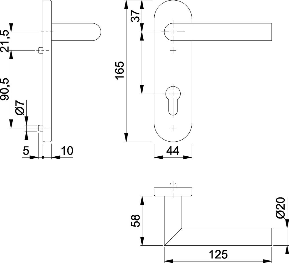 Kurzschild-Garnitur für Innentüren · geprüft nach DIN EN 1906: 47-0150A und PIVCERTPlus (1.000.000 Prüfzyklen), Objekt-Garnitur (Gebrauchs-Kategorie Klasse 4) · Lagerung: Türgriffe fest/drehbar (Wechselgarnitur: außen Knopf fest), Rückholfedern, HOPPE-Steckgriff-Verbindung mit Kugel-Arretierung Sertos®, wartungsfreie Gleitlager · Verbindung: HOPPE-Profilvollstift (Drückergrt.) / HOPPE-FDW-Profilvollstift (Wechselgrt.), gehärtet · TS 40 - 45 mm · Unterkonstruktion: Stahl, Stütznocken · Befestigung: verdeckt, durchgehend, Gewindeschrauben M5