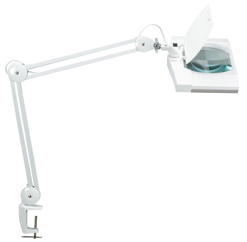 · Echtglas-Linse mit 3 Dioptrien (1,75-fache Vergrößerung), L x B 7,5" x 6,2" (195 x 157 mm), Linsenfläche 307 cm2 · Eine Lichtquelle, 6500 Kelvin, tageslichtweiß · 1830 Lux Beleuchtungsstärke bei 350 mm Abstand, Lichtstrom je Lichtquelle 949 Lumen · Schalter am Leuchtenkopf ∙ Energieeffizienzklass E (Spektrum A-G) ∙ Gewichteter Energieverbrauch 7 kWh / 1000 h