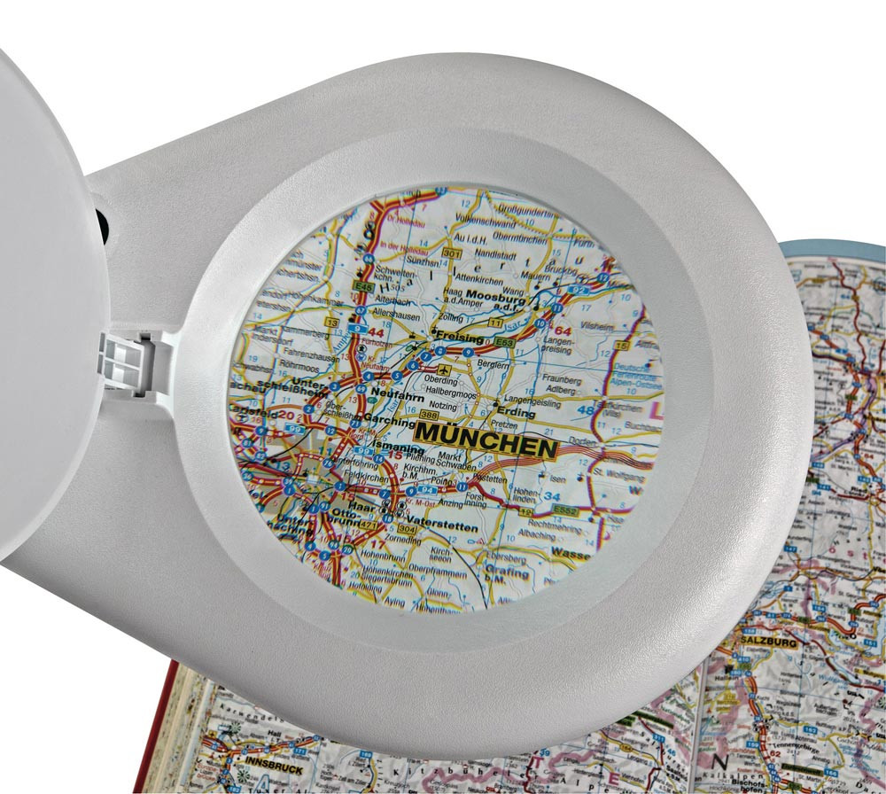 Kunststoff/Metall · mit Tischklemme oder Standfuß · Parallelogramm-Metallarm drehbar, neigbar · 3 Dioptrien-Echtglas-Linse (1,75-fache Vergrößerung), Ø 5″ (127 mm), Linsenfläche 144 cm² · Armlänge unten/oben 410 mm - Höhe 495 mm - (mit Tischklemme) · Armlänge unten/oben 310 mm - Höhe 482 mm - (mit Standfuß) · Betriebsspannung 220-240 V ″ Lichtfarbe 6.500 Kelvin - tageslichtweiß · gewichteter Energieverbrauch 8 kWh/1000 h · Lichtstrom 935 Lumen · Lebensdauer 50.000 Stunden · Effizienzklasse E (Spektrum A bis G)