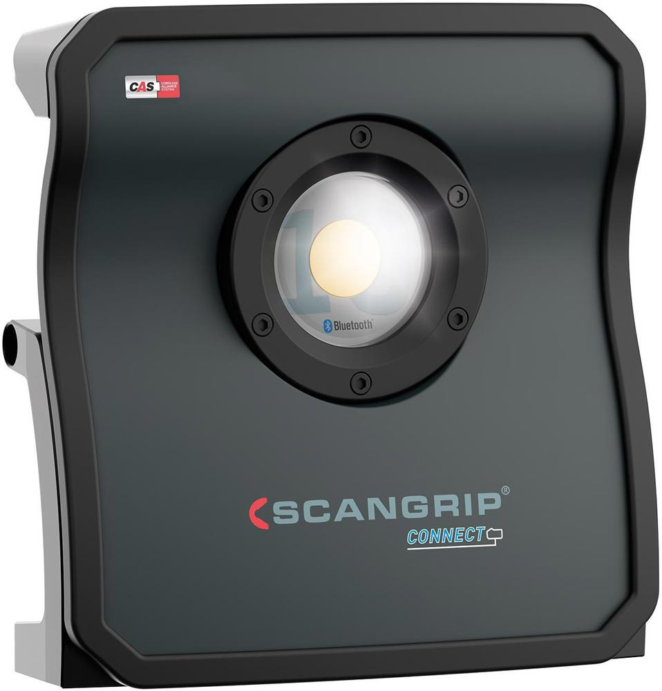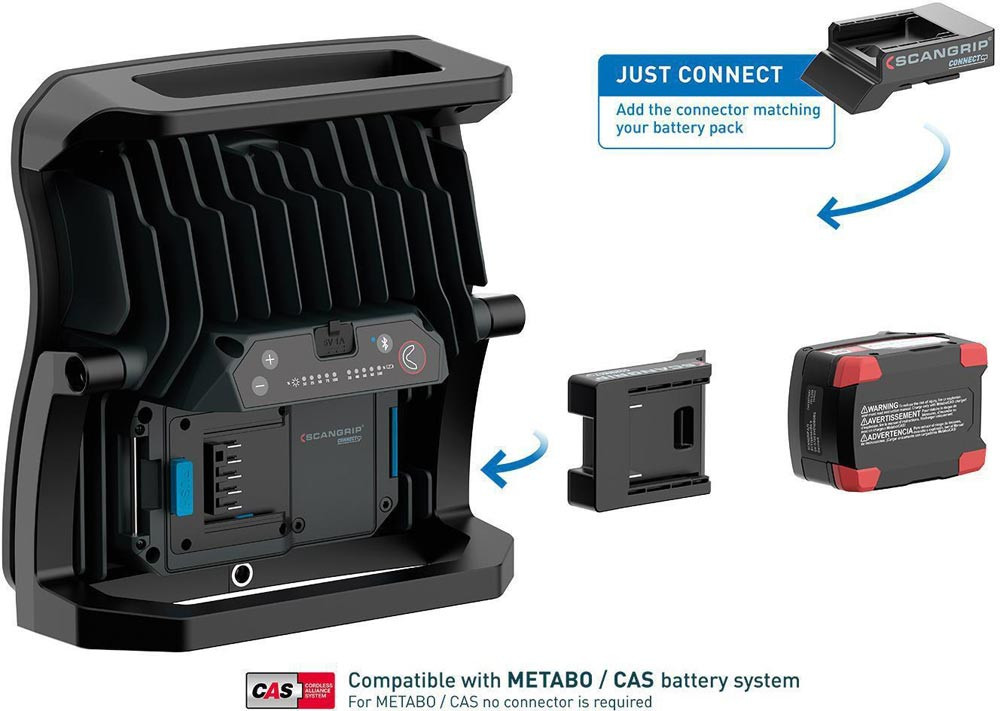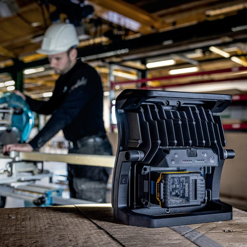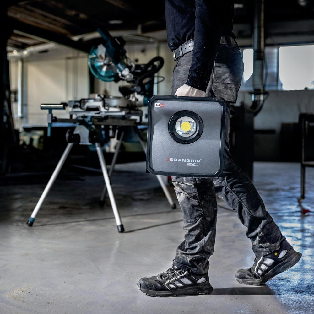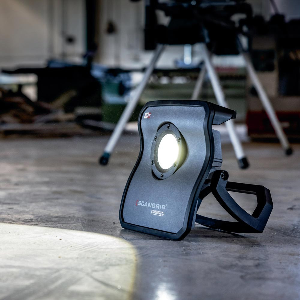 hocheffiziente COB-LED-Arbeitsleuchte mit 10000 Lumen für 18-V-Akkupacks · Dimmfunktion · Anzeige für Akkustand und Lichtleistung · eingebaute Powerbank · Tragegriff und Stellfuß für flexible Ausrichtung und Direktmontage am SCANGRIP-Stativ · Schutzart IP65 · Lieferung ohne Akku/Connector