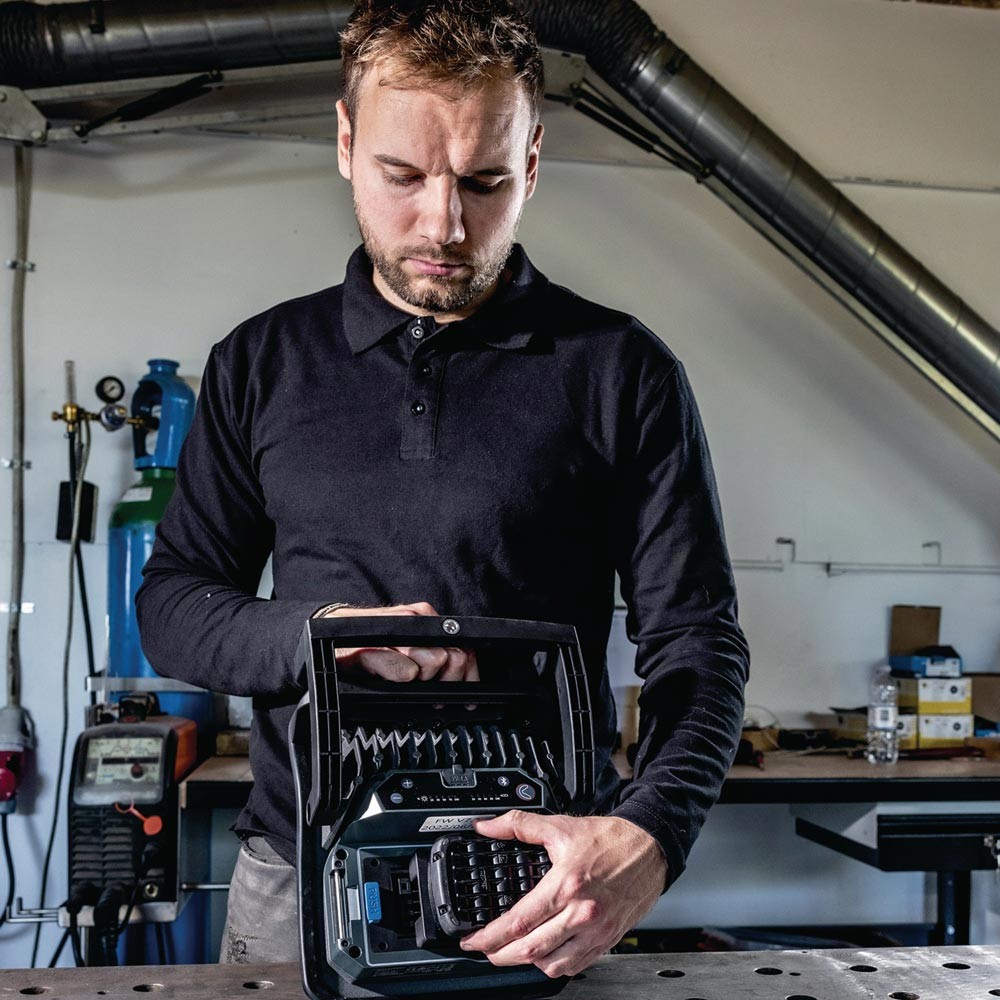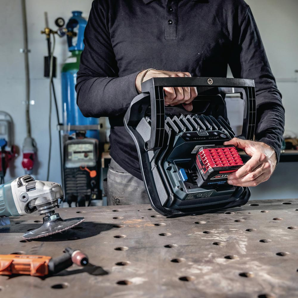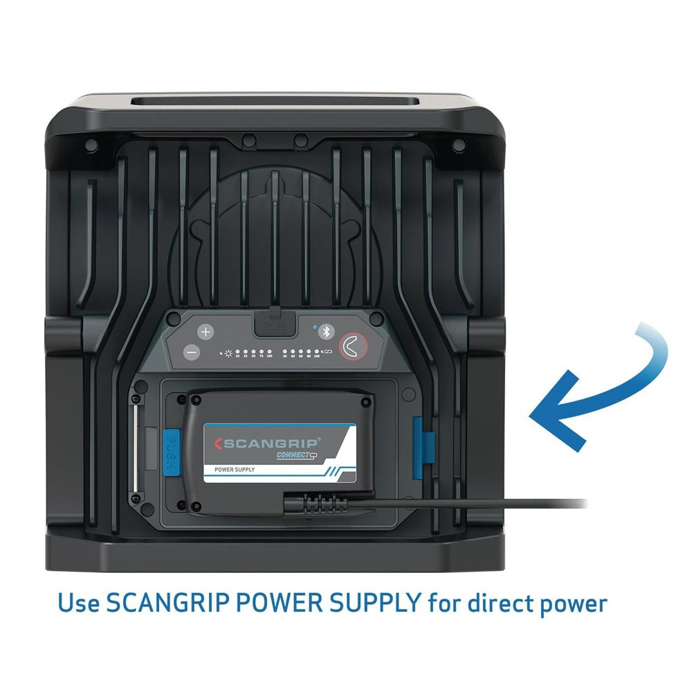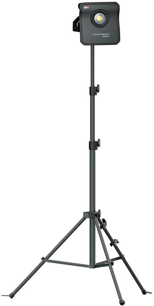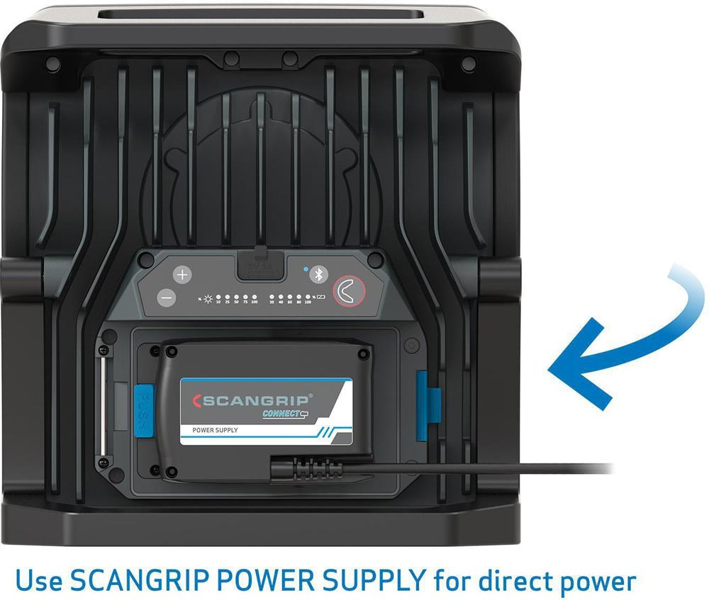 hocheffiziente COB-LED-Arbeitsleuchte mit 10000 Lumen für 18-V-Akkupacks · Dimmfunktion · Anzeige für Akkustand und Lichtleistung · eingebaute Powerbank · Tragegriff und Stellfuß für flexible Ausrichtung und Direktmontage am SCANGRIP-Stativ · Schutzart IP65 · Lieferung ohne Akku/Connector