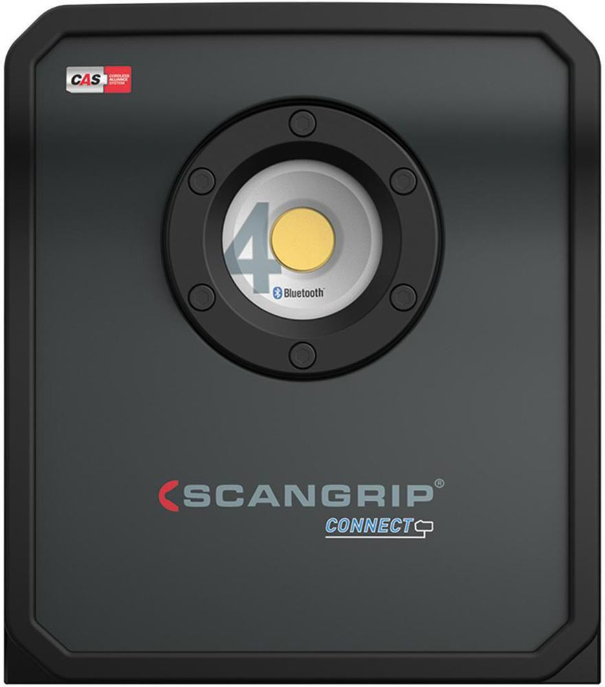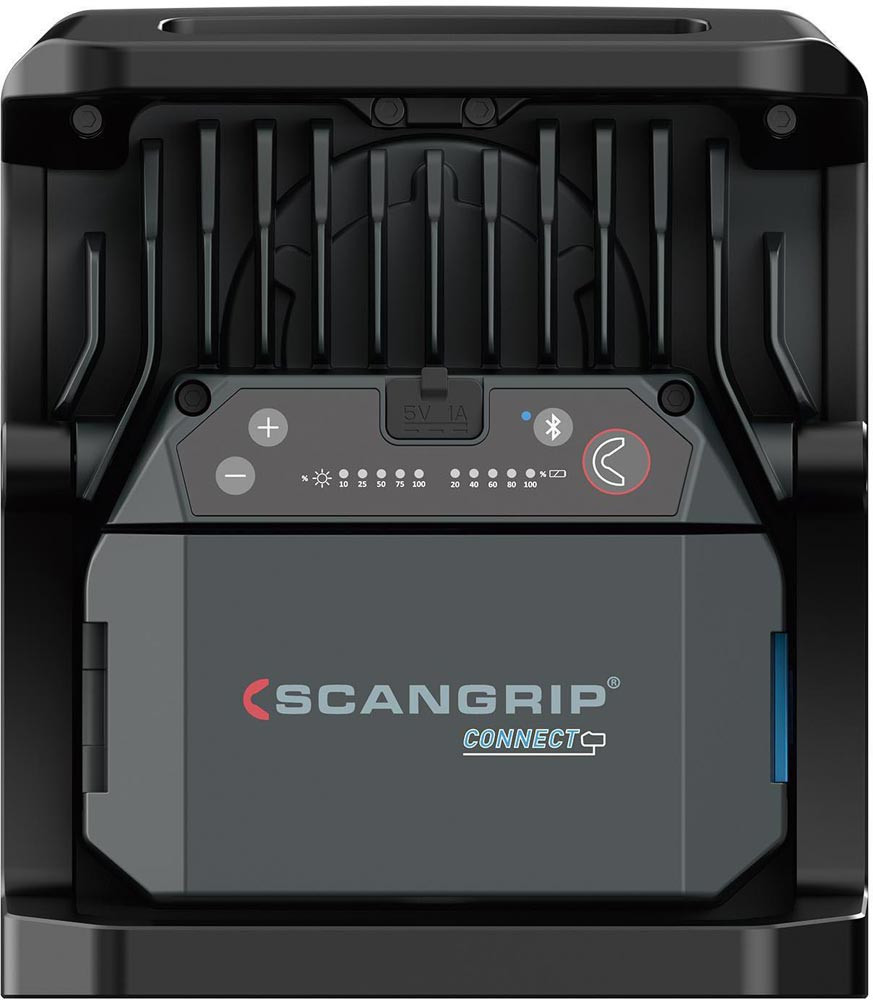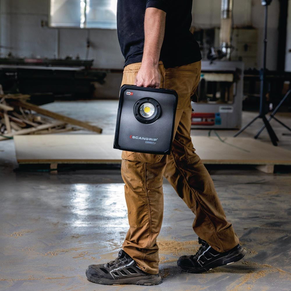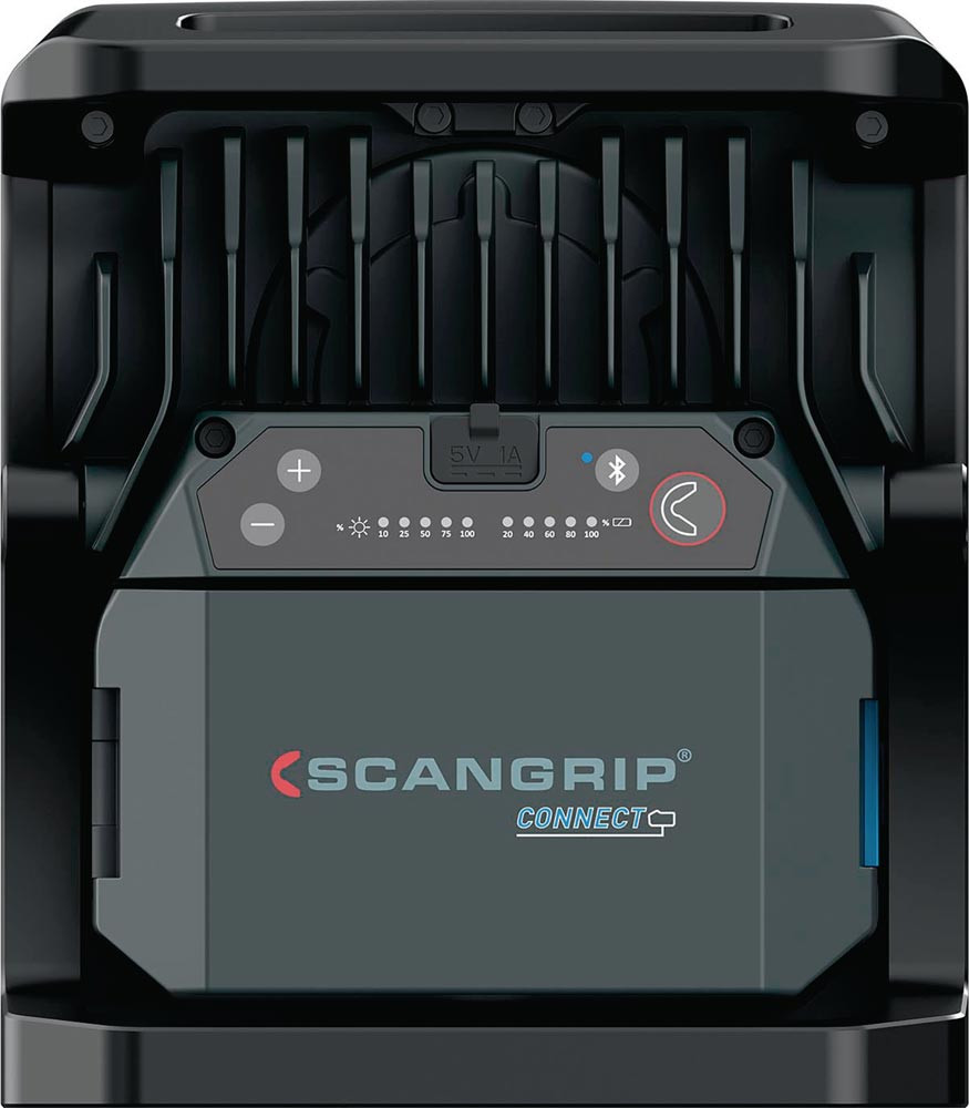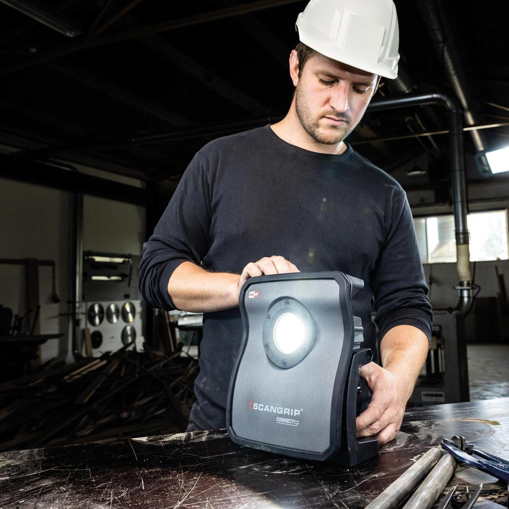 hocheffiziente E COB-LED-Arbeitsleuchte mit 4000 Lumen für 18-V-Akkupacks · extrem robuste akkubetriebene Arbeitsleuchte · Dimmfunktion · Anzeige für Akkustand und Lichtleistung · eingebaute Powerbank · Tragegriff und Stellfuß für flexible Ausrichtung und Direktmontage am SCANGRIP-Stativ · Schutzart IP65
