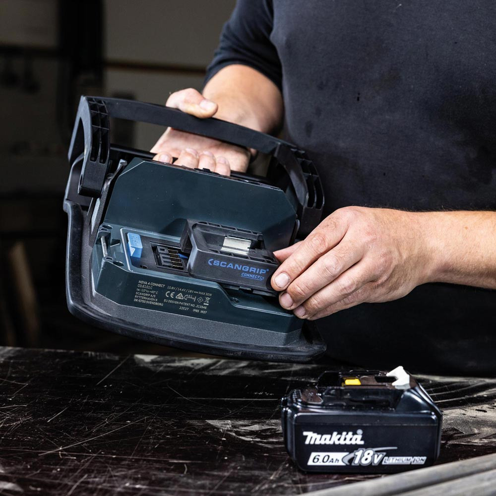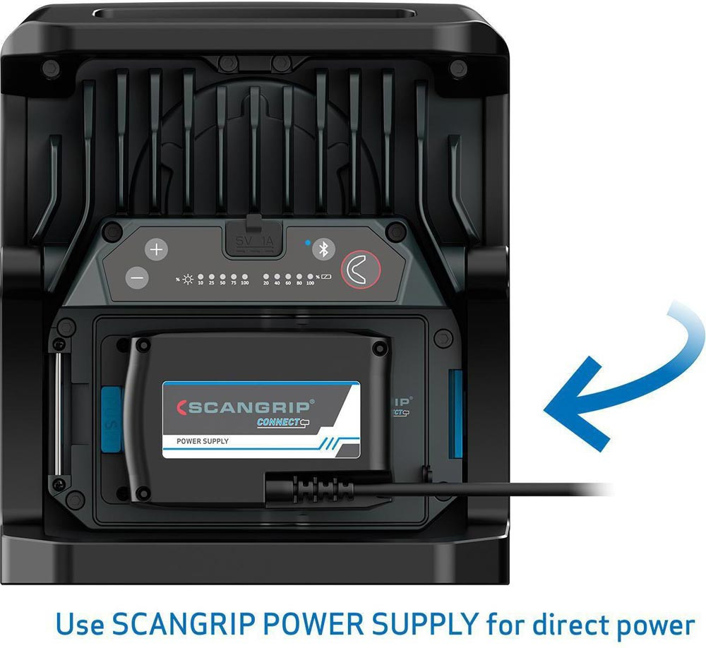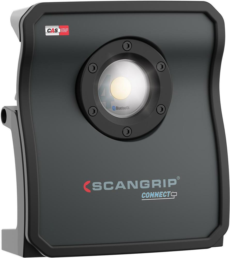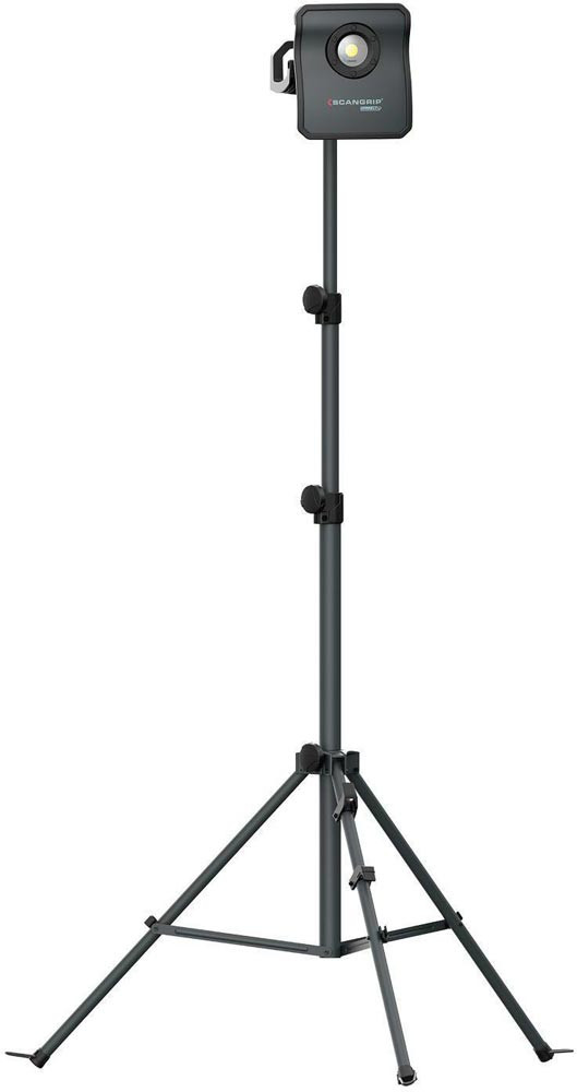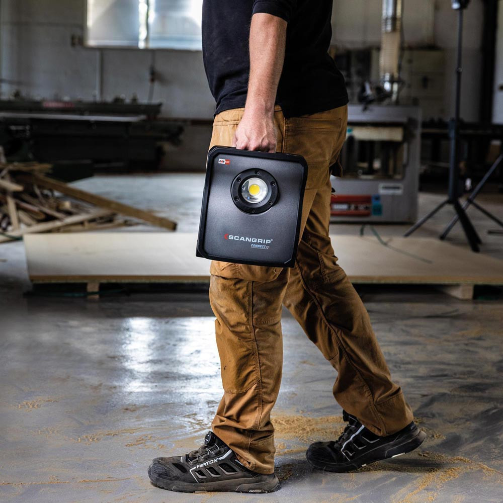 hocheffiziente E COB-LED-Arbeitsleuchte mit 4000 Lumen für 18-V-Akkupacks · extrem robuste akkubetriebene Arbeitsleuchte · Dimmfunktion · Anzeige für Akkustand und Lichtleistung · eingebaute Powerbank · Tragegriff und Stellfuß für flexible Ausrichtung und Direktmontage am SCANGRIP-Stativ · Schutzart IP65