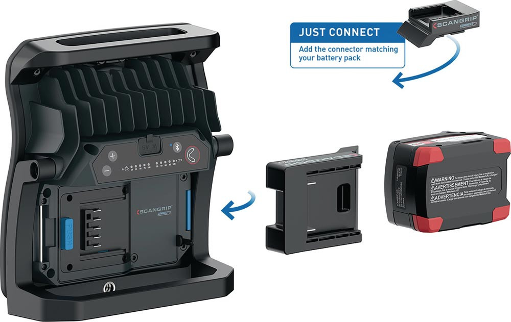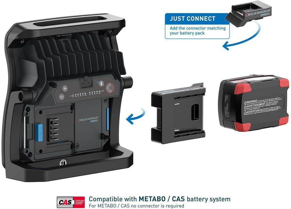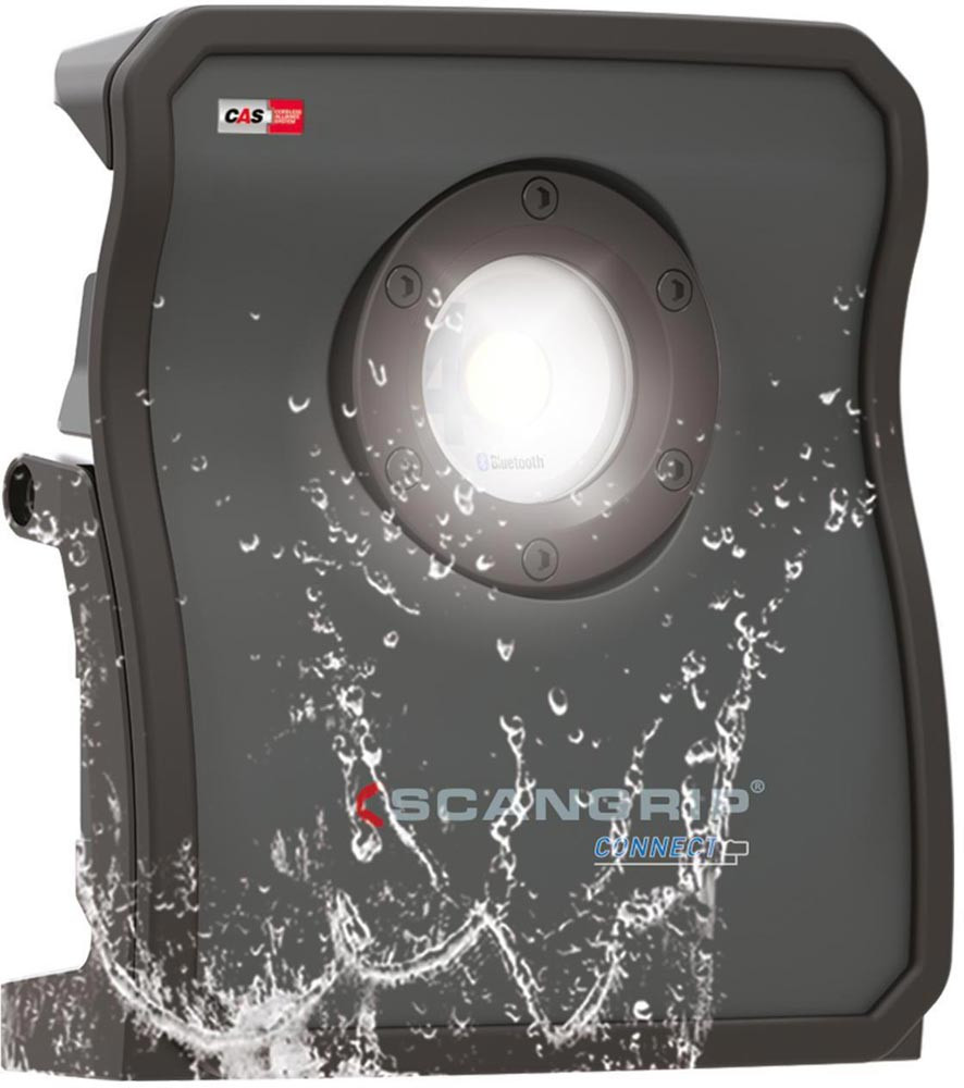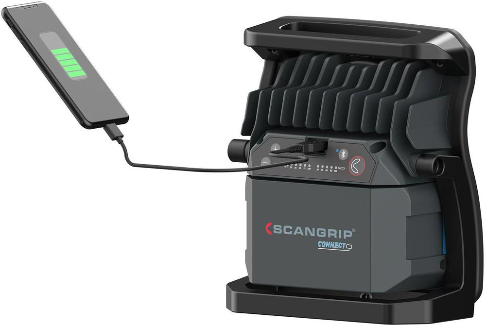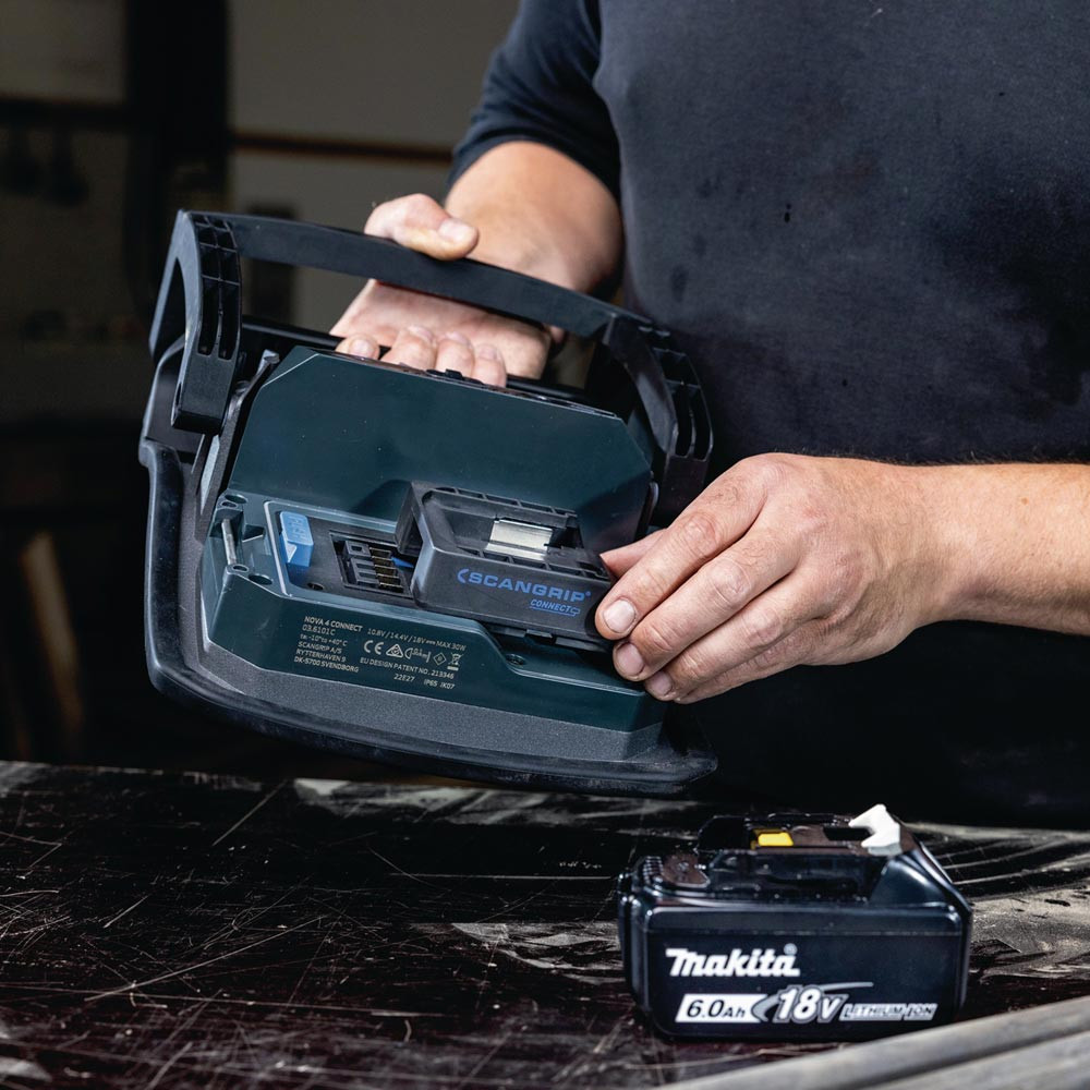 hocheffiziente E COB-LED-Arbeitsleuchte mit 4000 Lumen für 18-V-Akkupacks · extrem robuste akkubetriebene Arbeitsleuchte · Dimmfunktion · Anzeige für Akkustand und Lichtleistung · eingebaute Powerbank · Tragegriff und Stellfuß für flexible Ausrichtung und Direktmontage am SCANGRIP-Stativ · Schutzart IP65
