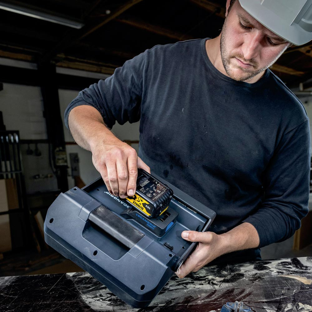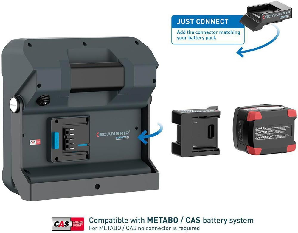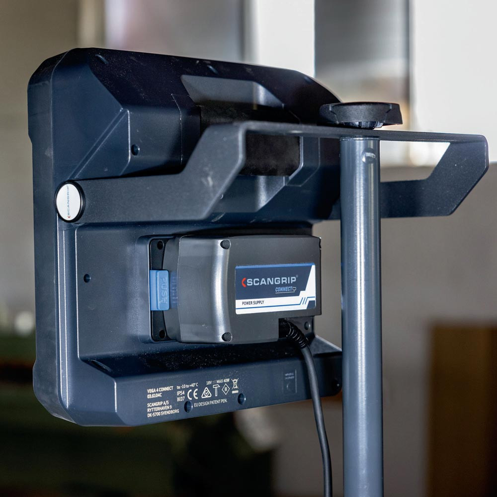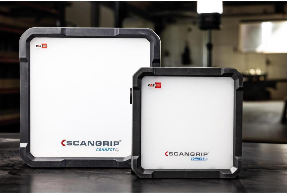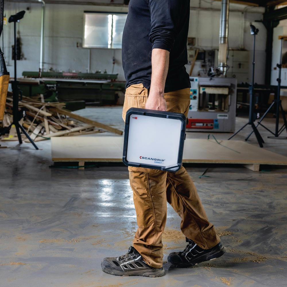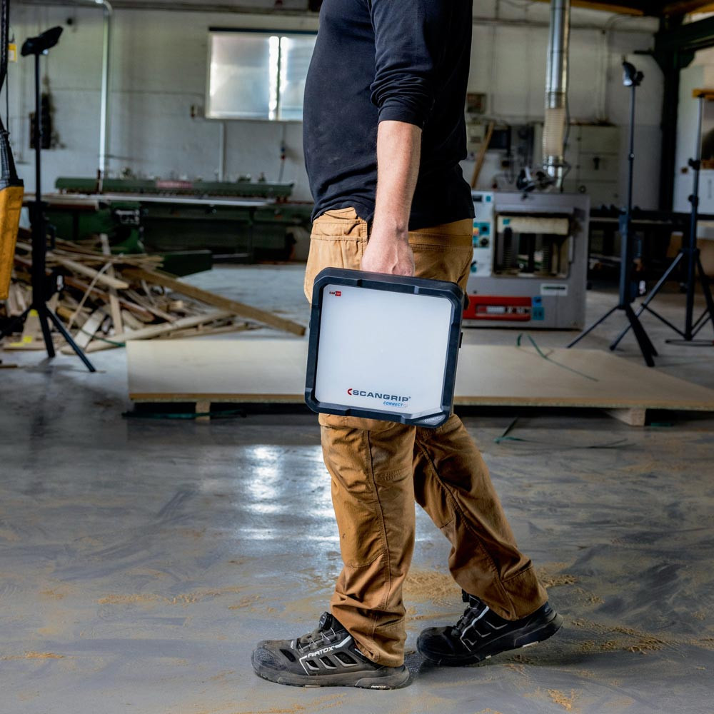 wasserdicht (IP54) · diffuses, blendfreies Arbeitslicht · einheitliche Lichtintensität und große Lichtstreuung · zwei Lichtstufen (50-100 %) · integrierter Handgriff und Stellfuß für Montage am SCANGRIP Stativ · robustes, schlagfestes Kunststoffgehäuse · die LEDs entwickeln keine Wärme und deshalb gibt es keine Brandgefahr