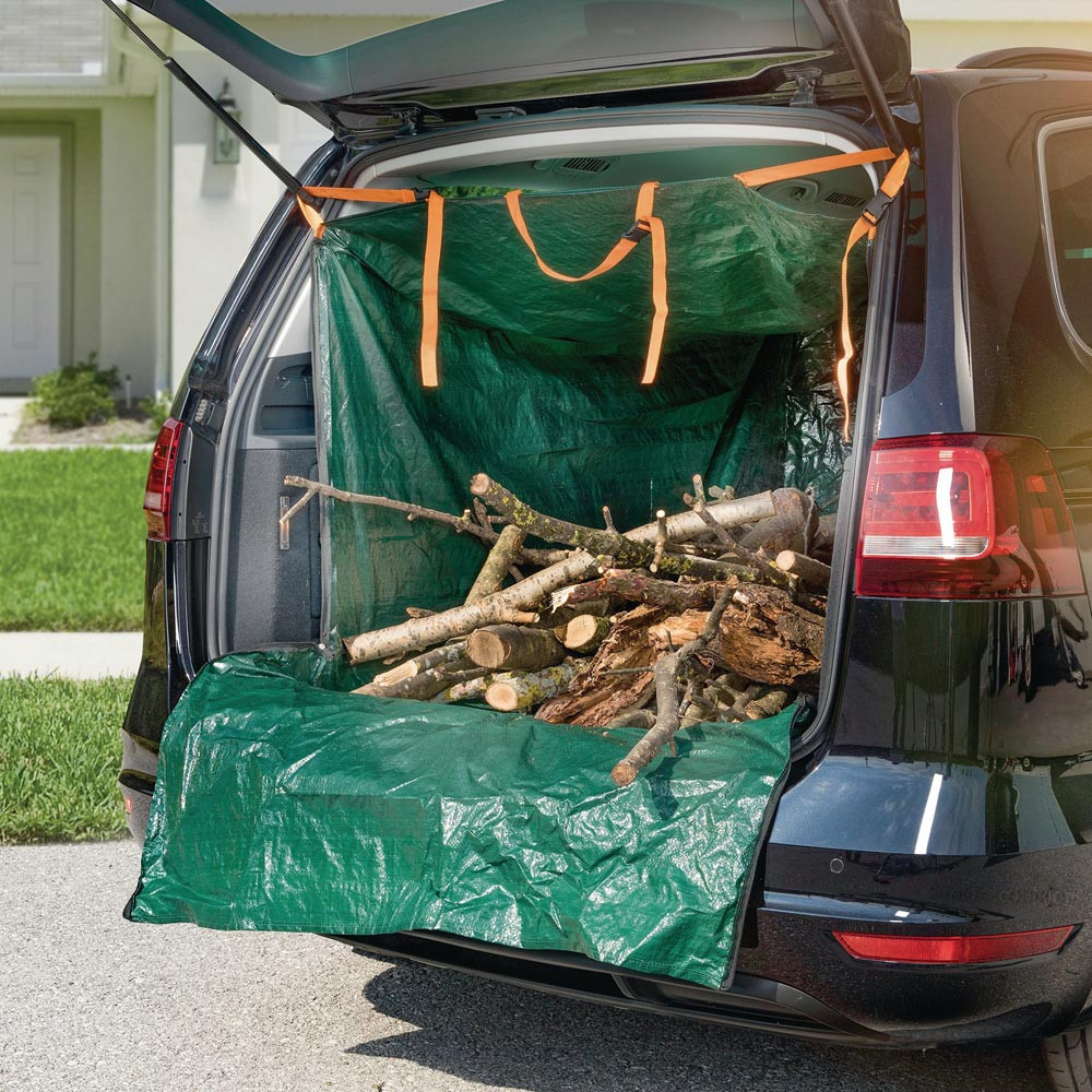 ideal für Kombi, SUV und Van Kofferräume, schützt vor Schmutz, Nässe und Beschädigungen · einfacher Abtransport verschiedenster Gartenabfälle durch direktes Beladen ohne Säcke · Befestigungsschlaufen und bänder, Klettband an der Unterseite · mit den seitlichen Reißverschlüssen einfach verschließbar, schützt dadurch die Heckklappe und im geöffneten Zustand die Stoßstange · aus robustem HDPE-Gewebe