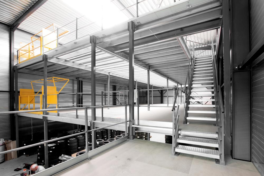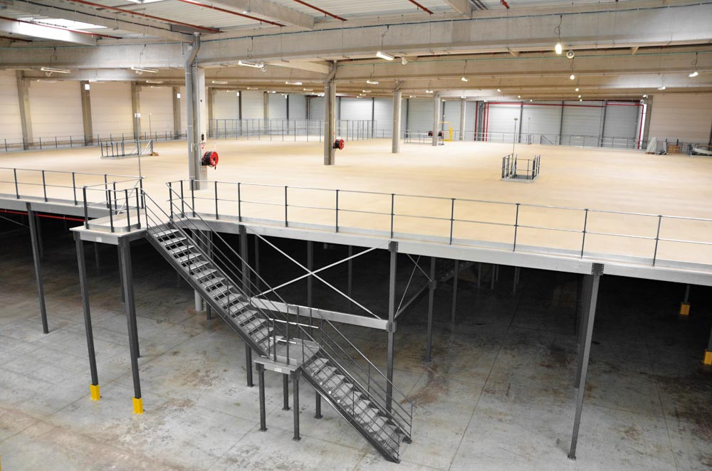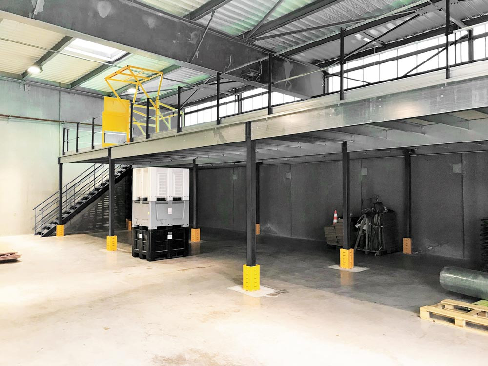 ∙ Hohe Stabilität und sicheres Befestigungssystem ∙ Alle Stahlteile sind hochwertig pulverbeschichtet ∙ Optional mit Treppe, Sicherheitsgeländer, Palettentür oder Palettenschleuse ∙ Belastung pro m2: 250-1000 kg (bei gleichmäßig verteilter Last) ∙ Festigkeitsberechnung entsprechend Eurocode 3 und gemäß FEM 10.2.02 TÜV-zertifiziert ∙ CE-zertifiziert nach europäischer Norm EU Nr. 305/2011 ∙ Treppe, Sicherheitsgeländer, Palettentür und Palettenschleuse gemäß EN ISO 14122-3 und NF E 85-015 (Verwendung nur im industriellen Bereich)