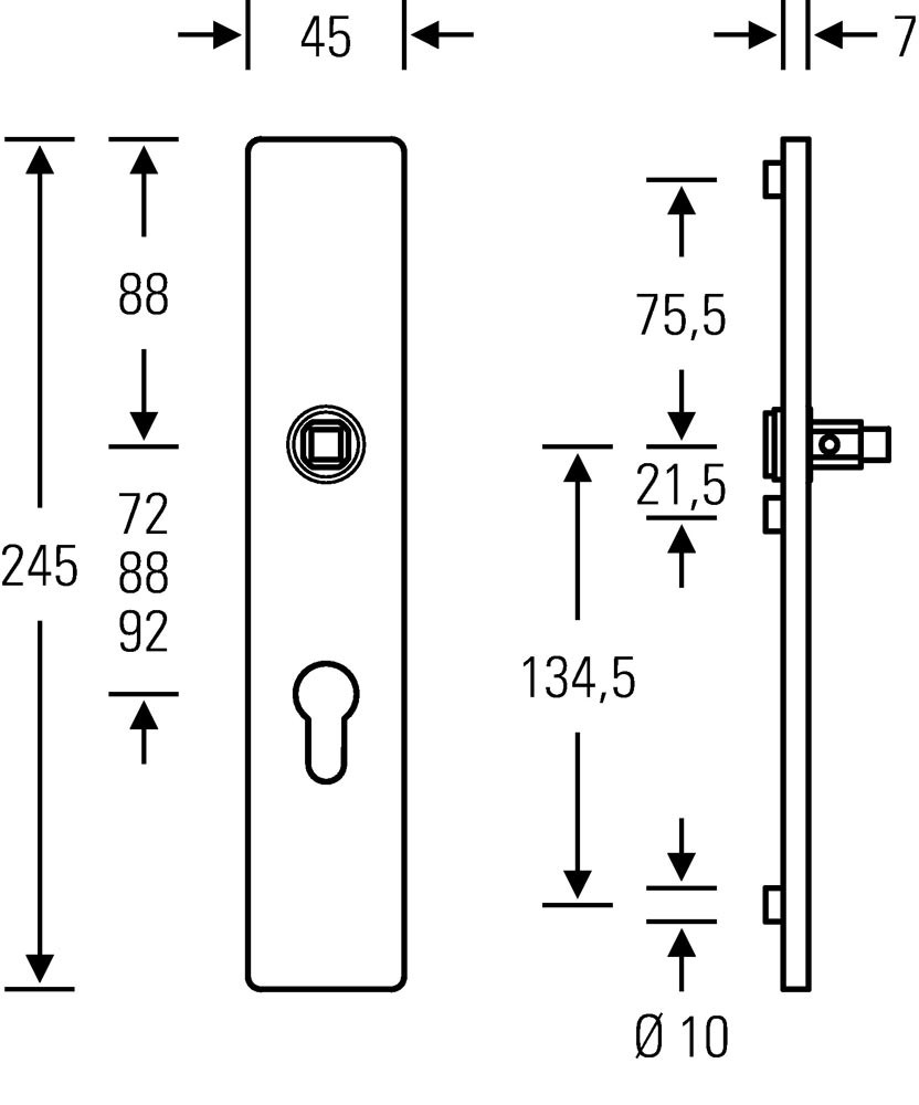 eckiges Langschild mit ASL®-Standardlagerung · mit Stütznocken und unsichtbarer Befestigung · passend für alle ASL®-Drückerlochteile · Vierkant 8mm · Entfernung BB/PZ 72 mm, Bad 78 mm