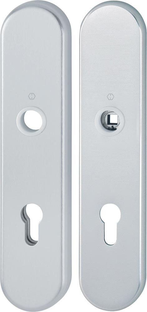 Das Schutz-Langschild-Paar ist ausschließlich mit HOPPESchnellstift-Türgriff-Lochteilen kombinierbar und entspricht nur so den Anforderungen der Schutzklasse ES1 (SK2).
